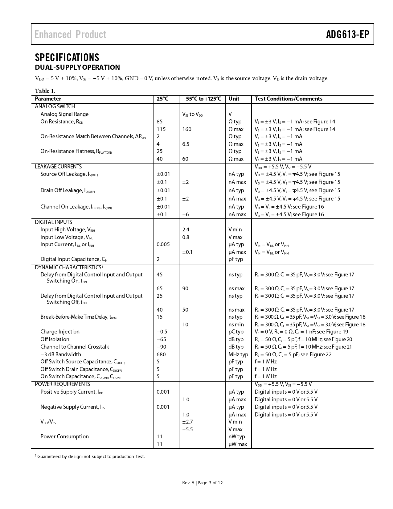 Enhanced Product. ADG613-EP. SPECIFICATIONS. DUAL-SUPPLY OPERATION. Table 1. Parameter. 25°C. −55°C to +125°C. Unit