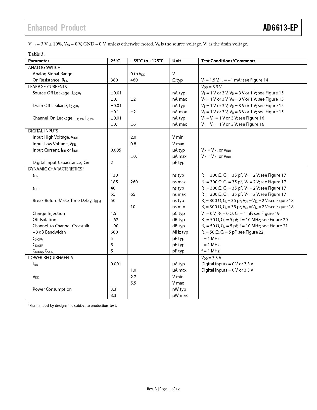 Enhanced Product. ADG613-EP. Table 3. Parameter. 25°C. −55°C to +125°C. Unit. Test Conditions/Comments