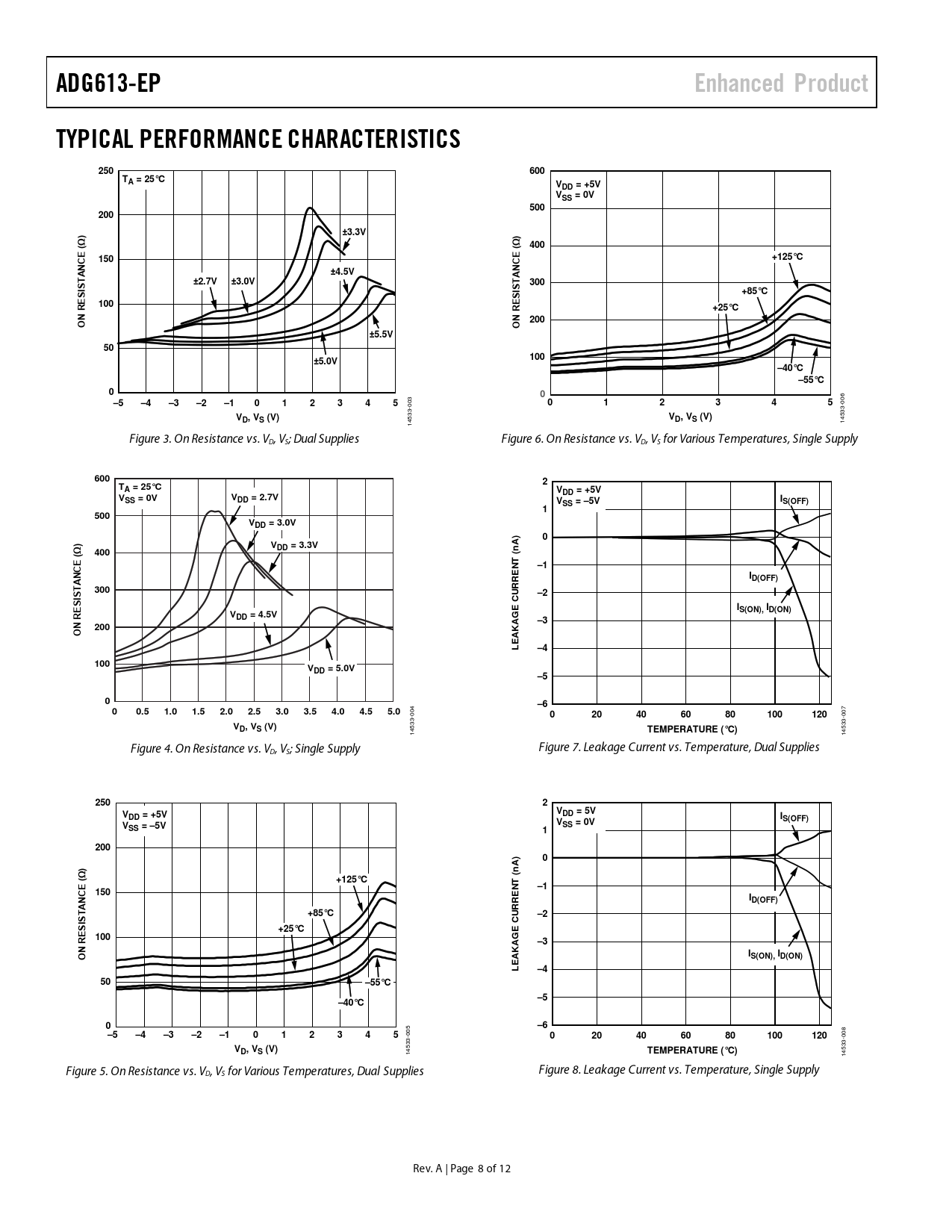14533- 14533- Figure 4. On Resistance vs. VD, VS; Single Supply Figure 7. Leakage Current vs. Temperature, Dual Supplies