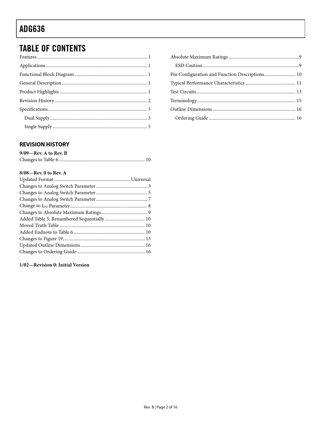 ADG636. TABLE OF CONTENTS. REVISION HISTORY. 9/09—Rev. A to Rev. B. 8/08—Rev. 0 to Rev. A. 1/02—Revision 0: Initial Version