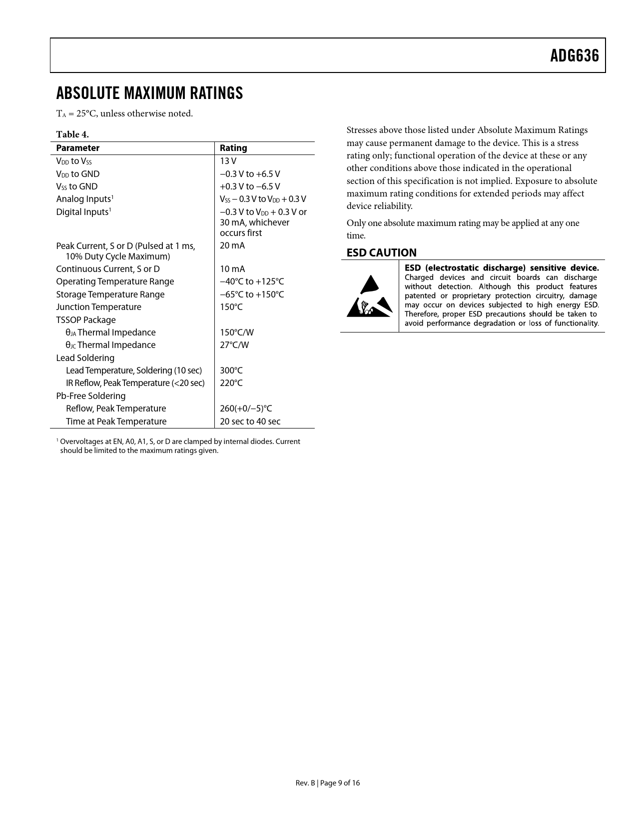Seiten / Seite16 / 9 — ADG636. ABSOLUTE MAXIMUM RATINGS. Table 4. Parameter Rating. ESD CAUTION