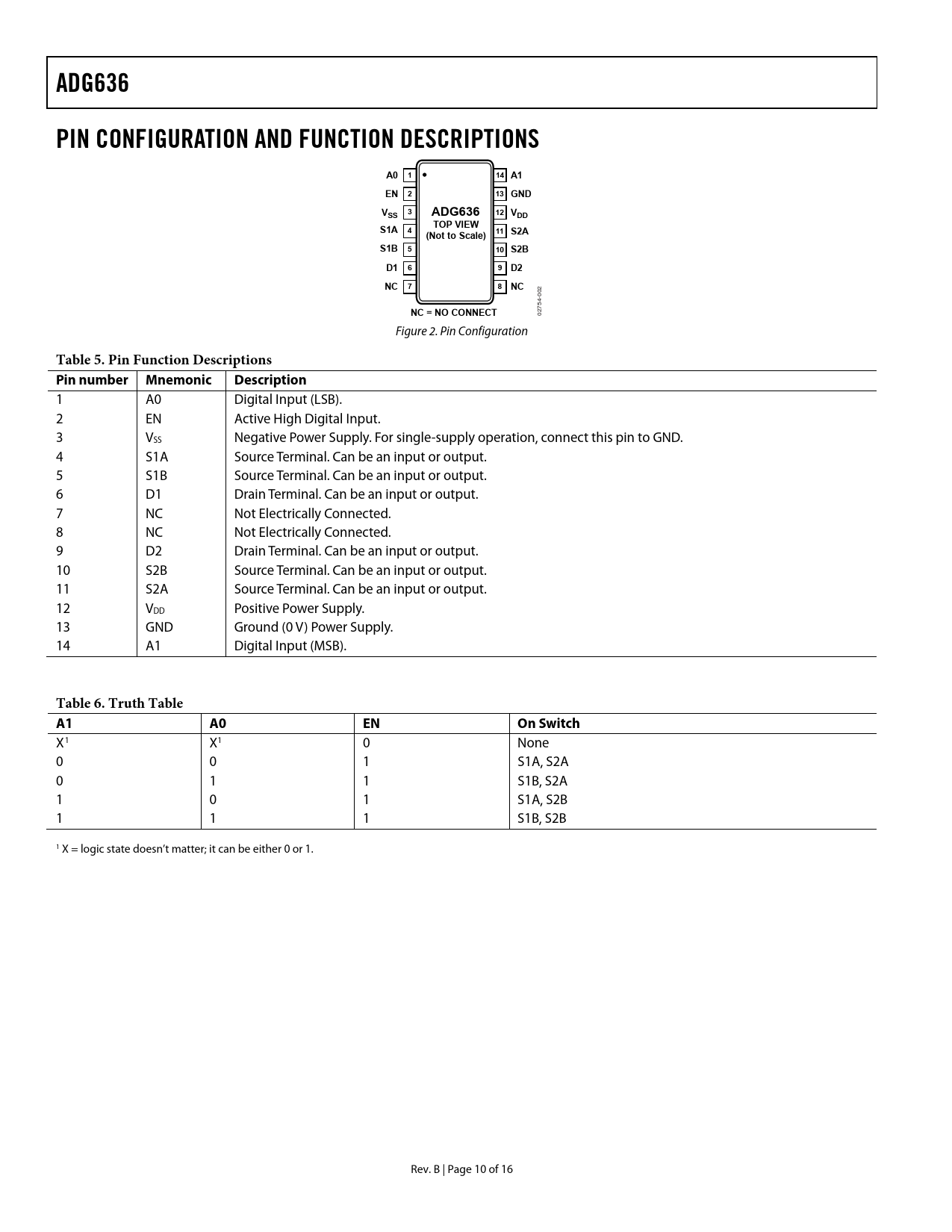 ADG636. PIN CONFIGURATION AND FUNCTION DESCRIPTIONS. A0 1. 14 A1. EN 2. 13 GND. VSS 3. 12 VDD. TOP VIEW. S1A 4. 11 S2A. (Not to Scale). S1B 5
