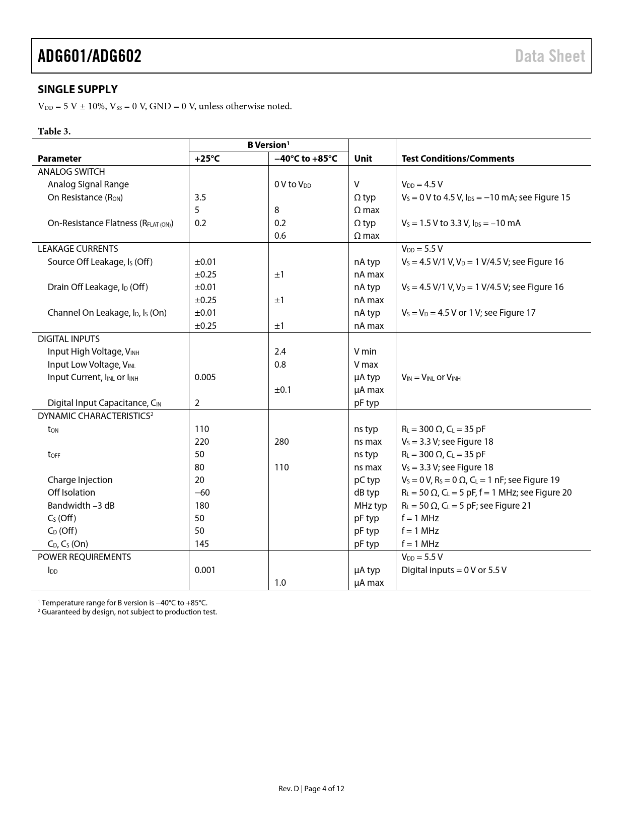 link to page 10 link to page 10 link to page 10 link to page 10 link to page 10 link to page 10 link to page 10 link to page 10 link to page 10 ADG601/ADG602Data SheetSINGLE SUPPLY VDD = 5 V ± 10%, VSS = 0 V, GND = 0 V, unless otherwise noted. Table 3. BVersion1Parameter+25°C−40°C to +85°CUnitTest Conditions/Comments ANALOG SWITCH Analog Signal Range 0 V to VDD V VDD = 4.5 V On Resistance (RON) 3.5 Ω typ VS = 0 V to 4.5 V, IDS = −10 mA; see Figure 15 5 8 Ω max On-Resistance Flatness (RFLAT (ON)) 0.2 0.2 Ω typ VS = 1.5 V to 3.3 V, IDS = –10 mA 0.6 Ω max LEAKAGE CURRENTS VDD = 5.5 V Source Off Leakage, IS (Off ) ±0.01 nA typ VS = 4.5 V/1 V, VD = 1 V/4.5 V; see Figure 16 ±0.25 ±1 nA max Drain Off Leakage, ID (Off ) ±0.01 nA typ VS = 4.5 V/1 V, VD = 1 V/4.5 V; see Figure 16 ±0.25 ±1 nA max Channel On Leakage, ID, IS (On) ±0.01 nA typ VS = VD = 4.5 V or 1 V; see Figure 17 ±0.25 ±1 nA max DIGITAL INPUTS Input High Voltage, VINH 2.4 V min Input Low Voltage, VINL 0.8 V max Input Current, IINL or IINH 0.005 μA typ VIN = VINL or VINH ±0.1 μA max Digital Input Capacitance, CIN 2 pF typ DYNAMIC CHARACTERISTICS2 tON 110 ns typ RL = 300 Ω, CL = 35 pF 220 280 ns max VS = 3.3 V; see Figure 18 tOFF 50 ns typ RL = 300 Ω, CL = 35 pF 80 110 ns max VS = 3.3 V; see Figure 18 Charge Injection 20 pC typ VS = 0 V, RS = 0 Ω, CL = 1 nF; see Figure 19 Off Isolation −60 dB typ RL = 50 Ω, CL = 5 pF, f = 1 MHz; see Figure 20 Bandwidth –3 dB 180 MHz typ RL = 50 Ω, CL = 5 pF; see Figure 21 CS (Off ) 50 pF typ f = 1 MHz CD (Off ) 50 pF typ f = 1 MHz CD, CS (On) 145 pF typ f = 1 MHz POWER REQUIREMENTS VDD = 5.5 V IDD 0.001 μA typ Digital inputs = 0 V or 5.5 V 1.0 μA max 1 Temperature range for B version is −40°C to +85°C. 2 Guaranteed by design, not subject to production test. Rev. D | Page 4 of 12 Document Outline FEATURES APPLICATIONS FUNCTIONAL BLOCK DIAGRAMS GENERAL DESCRIPTION PRODUCT HIGHLIGHTS TABLE OF CONTENTS REVISION HISTORY SPECIFICATIONS DUAL SUPPLY SINGLE SUPPLY ABSOLUTE MAXIMUM RATINGS ESD CAUTION PIN CONFIGURATIONS AND FUNCTION DESCRIPTIONS TYPICAL PERFORMANCE CHARACTERISTICS TERMINOLOGY TEST CIRCUITS OUTLINE DIMENSIONS ORDERING GUIDE