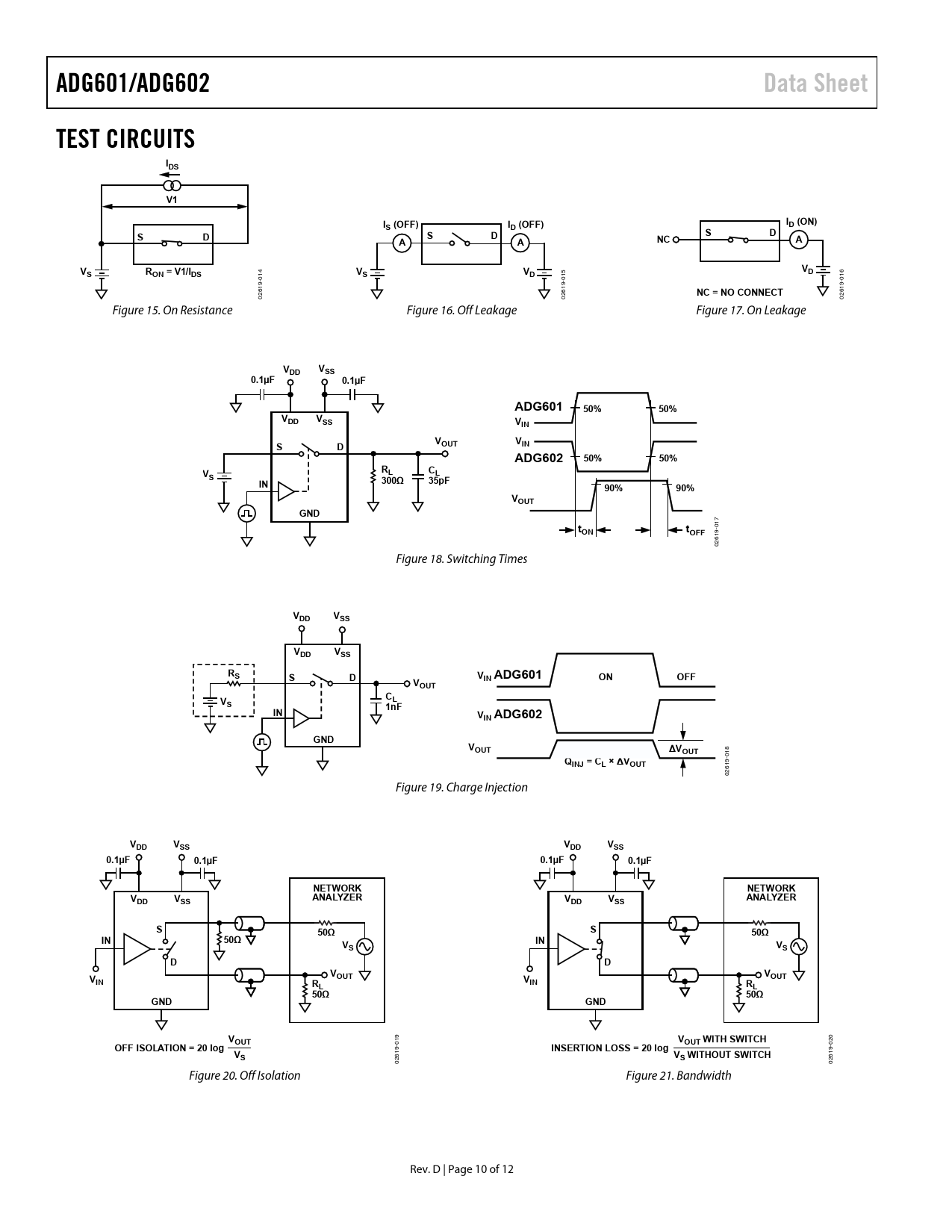 ADG601/ADG602. Data Sheet. TEST CIRCUITS. IDS. S (OFF). ID (OFF). D (ON). RON = V1/IDS. NC = NO CONNECT. VDD. VSS. 0.1µF. ADG601. 50%. VIN. OUT. ADG602