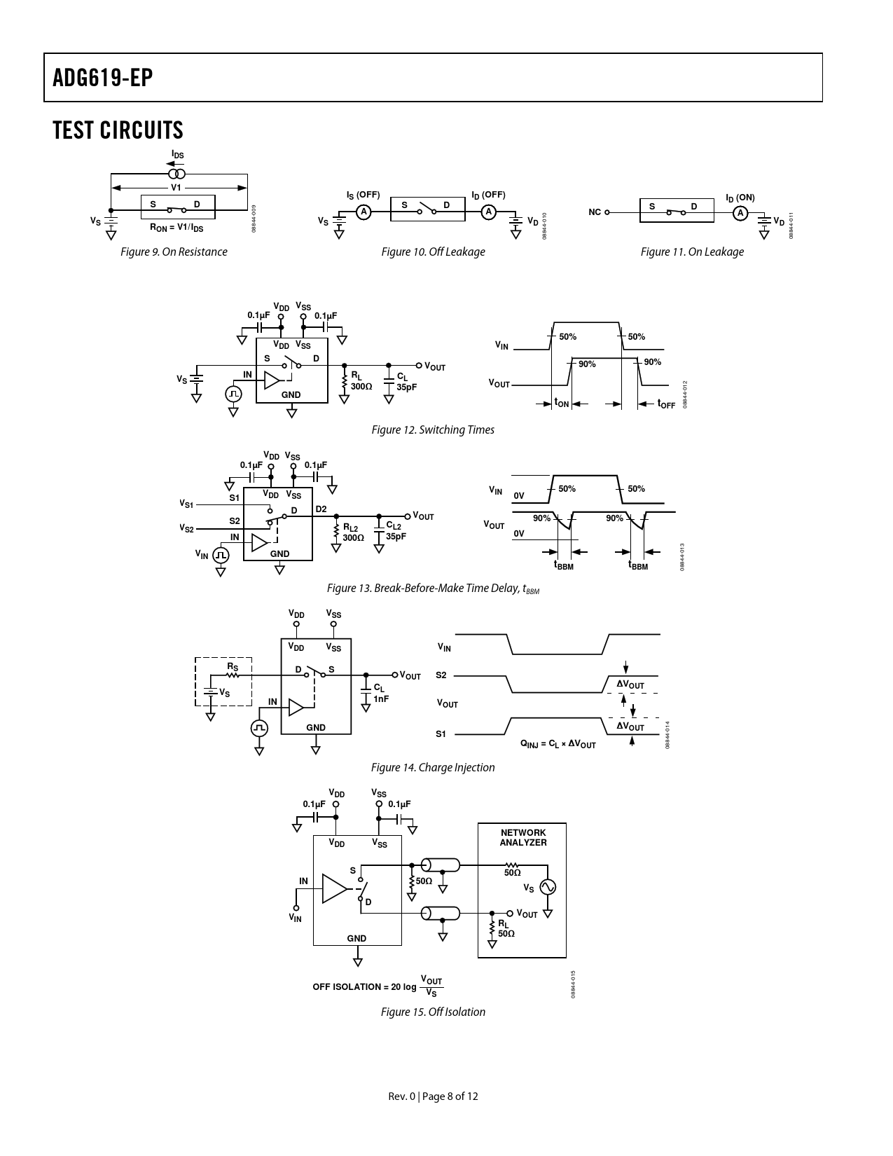 | Seiten / Seite | 12 / 8 — ADG619-EP. TEST CIRCUITS. IDS. S (OFF). D (OFF). ID (ON). ON = V1/ IDS. … |