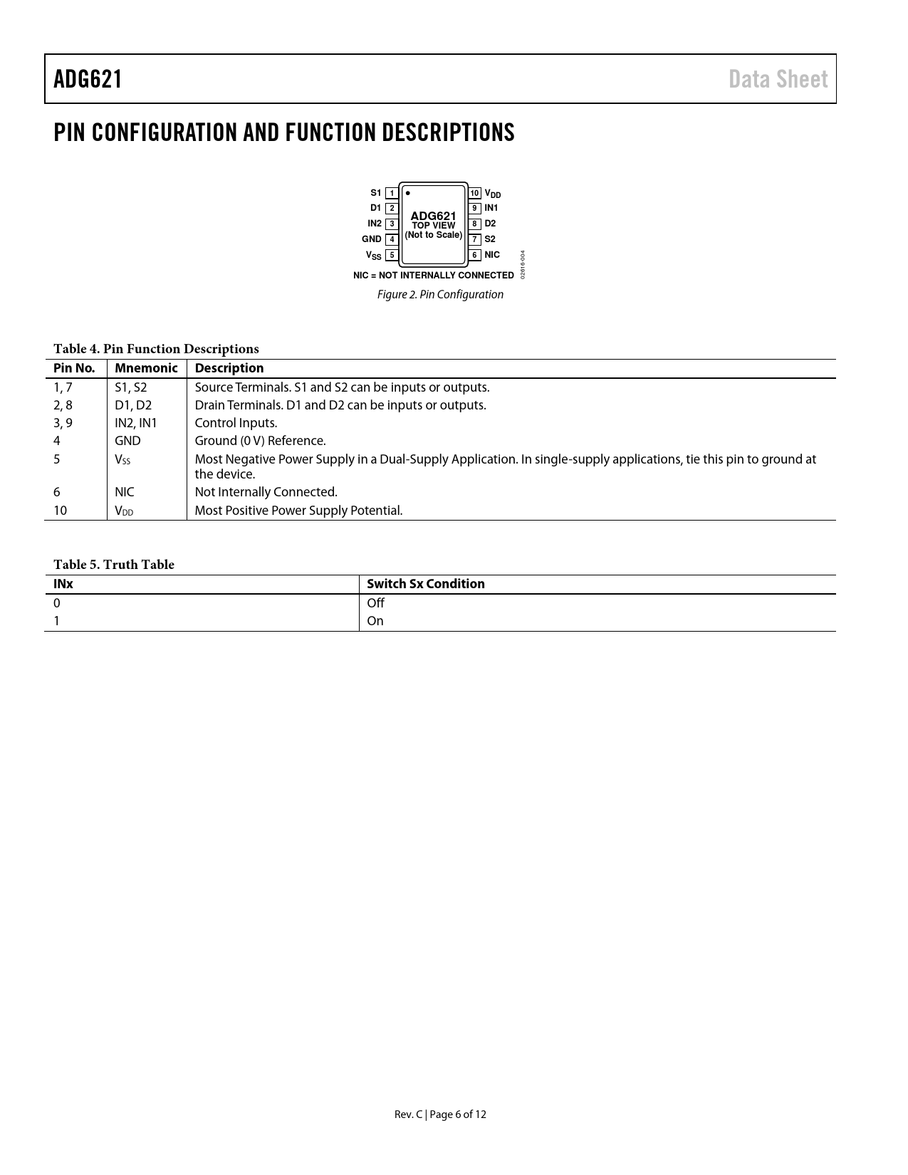 ADG621. Data Sheet. PIN CONFIGURATION AND FUNCTION DESCRIPTIONS. 10 VDD. IN1. IN2. TOP VIEW. (Not to Scale). GND. VSS 5. NIC