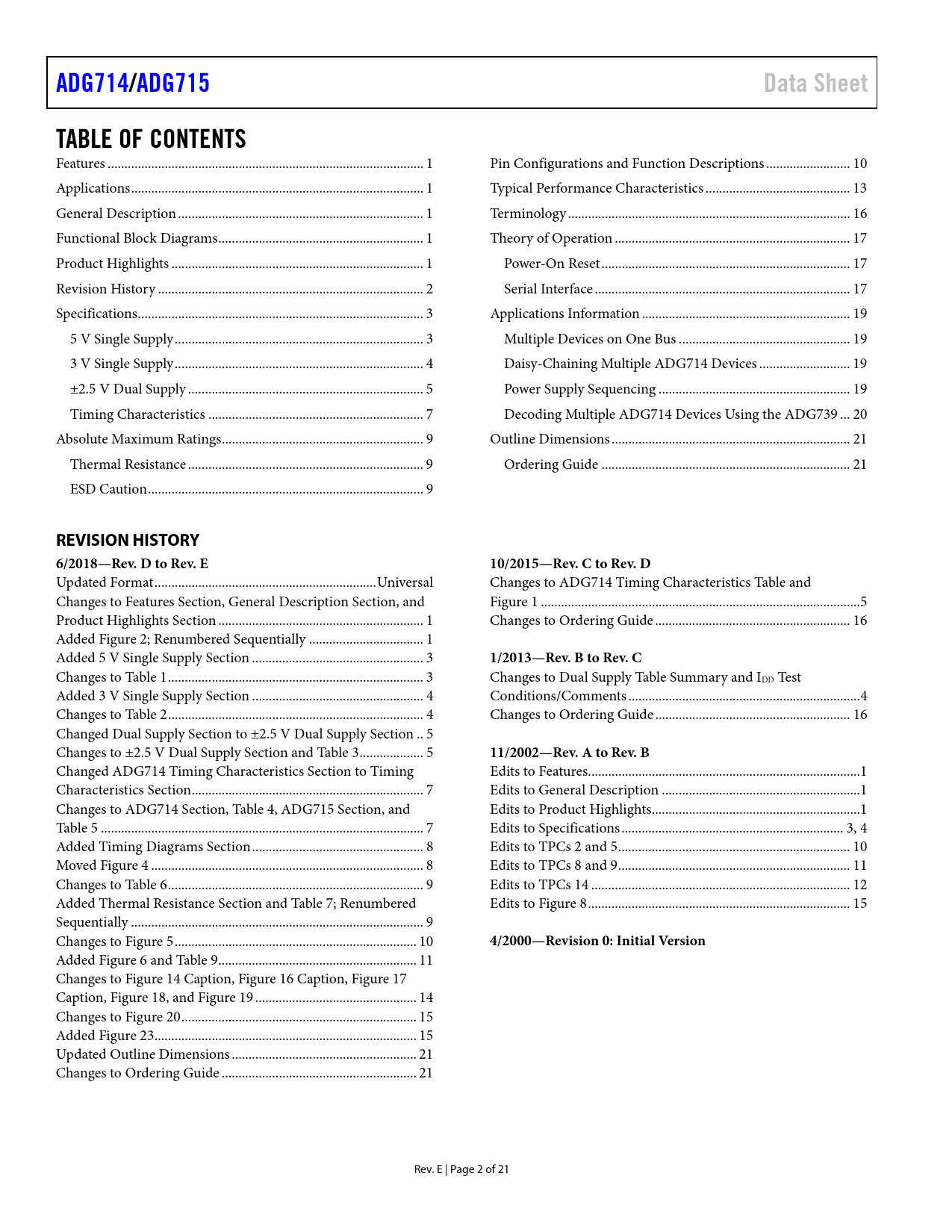 link to page 1 link to page 1 link to page 1 link to page 1 link to page 1 link to page 2 link to page 3 link to page 3 link to page 4 link to page 5 link to page 7 link to page 9 link to page 9 link to page 9 link to page 10 link to page 13 link to page 16 link to page 17 link to page 17 link to page 17 link to page 19 link to page 19 link to page 19 link to page 19 link to page 20 link to page 21 link to page 21 ADG714/ADG715Data SheetTABLE OF CONTENTS Features .. 1 Pin Configurations and Function Descriptions ... 10 Applications ... 1 Typical Performance Characteristics ... 13 General Description ... 1 Terminology .. 16 Functional Block Diagrams ... 1 Theory of Operation .. 17 Product Highlights ... 1 Power-On Reset .. 17 Revision History ... 2 Serial Interface .. 17 Specifications ... 3 Applications Information .. 19 5 V Single Supply .. 3 Multiple Devices on One Bus ... 19 3 V Single Supply .. 4 Daisy-Chaining Multiple ADG714 Devices ... 19 ±2.5 V Dual Supply .. 5 Power Supply Sequencing ... 19 Timing Characteristics .. 7 Decoding Multiple ADG714 Devices Using the ADG739 ... 20 Absolute Maximum Ratings .. 9 Outline Dimensions ... 21 Thermal Resistance .. 9 Ordering Guide .. 21 ESD Caution .. 9 REVISION HISTORY 6/2018—Rev. D to Rev. E10/2015—Rev. C to Rev. D Updated Format .. Universal Changes to ADG714 Timing Characteristics Table and Changes to Features Section, General Description Section, and Figure 1 ... 5 Product Highlights Section ... 1 Changes to Ordering Guide .. 16 Added Figure 2; Renumbered Sequentially .. 1 Added 5 V Single Supply Section ... 3 1/2013—Rev. B to Rev. C Changes to Table 1 .. 3 Changes to Dual Supply Table Summary and IDD Test Added 3 V Single Supply Section ... 4 Conditions/Comments ... 4 Changes to Table 2 .. 4 Changes to Ordering Guide .. 16 Changed Dual Supply Section to ±2.5 V Dual Supply Section .. 5 Changes to ±2.5 V Dual Supply Section and Table 3 ... 5 11/2002—Rev. A to Rev. B Changed ADG714 Timing Characteristics Section to Timing Edits to Features ... 1 Characteristics Section ... 7 Edits to General Description ... 1 Changes to ADG714 Section, Table 4, ADG715 Section, and Edits to Product Highlights .. 1 Table 5 .. 7 Edits to Specifications .. 3, 4 Added Timing Diagrams Section ... 8 Edits to TPCs 2 and 5 ... 10 Moved Figure 4 ... 8 Edits to TPCs 8 and 9 ... 11 Changes to Table 6 .. 9 Edits to TPCs 14 ... 12 Added Thermal Resistance Section and Table 7; Renumbered Edits to Figure 8 .. 15 Sequentially ... 9 Changes to Figure 5 .. 10 4/2000—Revision 0: Initial Version Added Figure 6 and Table 9 ... 11 Changes to Figure 14 Caption, Figure 16 Caption, Figure 17 Caption, Figure 18, and Figure 19 .. 14 Changes to Figure 20 .. 15 Added Figure 23 .. 15 Updated Outline Dimensions ... 21 Changes to Ordering Guide .. 21 Rev. E | Page 2 of 21 Document Outline Features Applications General Description Functional Block Diagrams Product Highlights Revision History Specifications 5 V Single Supply 3 V Single Supply ±2.5 V Dual Supply Timing Characteristics ADG714 ADG715 Timing Diagrams Absolute Maximum Ratings Thermal Resistance ESD Caution Pin Configurations and Function Descriptions Typical Performance Characteristics Terminology Theory of Operation Power-On Reset Serial Interface 3-Wire Serial Interface 2-Wire Serial Interface Input Shift Register Write Operation Read Operation Applications Information Multiple Devices on One Bus Daisy-Chaining Multiple ADG714 Devices Power Supply Sequencing Decoding Multiple ADG714 Devices Using the ADG739 Outline Dimensions Ordering Guide