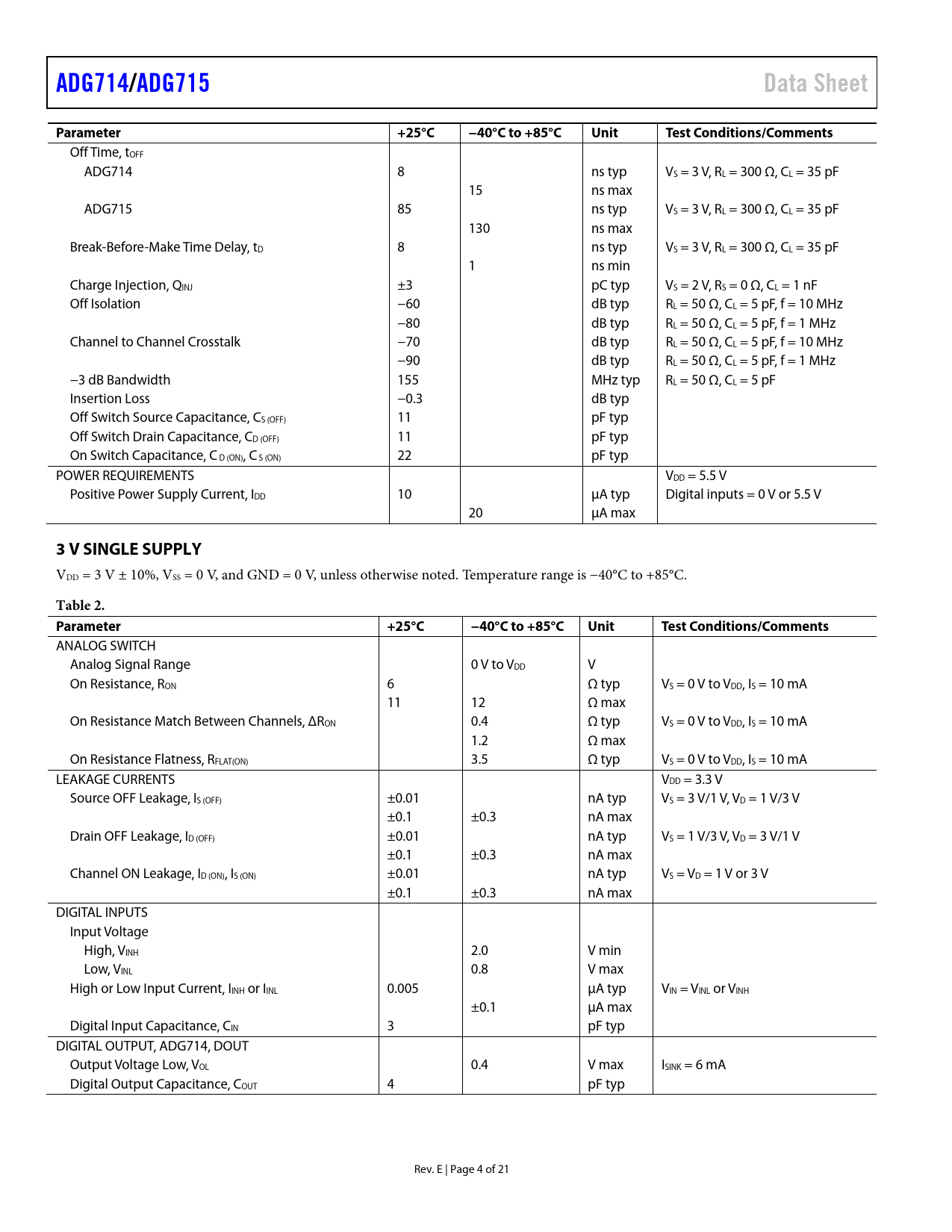 ADG714/ADG715Data SheetParameter+25°C−40°C to +85°CUnitTest Conditions/Comments Off Time, tOFF ADG714 8 ns typ VS = 3 V, RL = 300 Ω, CL = 35 pF 15 ns max ADG715 85 ns typ VS = 3 V, RL = 300 Ω, CL = 35 pF 130 ns max Break-Before-Make Time Delay, tD 8 ns typ VS = 3 V, RL = 300 Ω, CL = 35 pF 1 ns min Charge Injection, QINJ ±3 pC typ VS = 2 V, RS = 0 Ω, CL = 1 nF Off Isolation −60 dB typ RL = 50 Ω, CL = 5 pF, f = 10 MHz −80 dB typ RL = 50 Ω, CL = 5 pF, f = 1 MHz Channel to Channel Crosstalk −70 dB typ RL = 50 Ω, CL = 5 pF, f = 10 MHz −90 dB typ RL = 50 Ω, CL = 5 pF, f = 1 MHz −3 dB Bandwidth 155 MHz typ RL = 50 Ω, CL = 5 pF Insertion Loss −0.3 dB typ Off Switch Source Capacitance, CS (OFF) 11 pF typ Off Switch Drain Capacitance, CD (OFF) 11 pF typ On Switch Capacitance, C D (ON), C S (ON) 22 pF typ POWER REQUIREMENTS VDD = 5.5 V Positive Power Supply Current, IDD 10 µA typ Digital inputs = 0 V or 5.5 V 20 µA max 3 V SINGLE SUPPLY VDD = 3 V ± 10%, VSS = 0 V, and GND = 0 V, unless otherwise noted. Temperature range is −40°C to +85°C. Table 2. Parameter+25°C−40°C to +85°CUnitTest Conditions/Comments ANALOG SWITCH Analog Signal Range 0 V to VDD V On Resistance, RON 6 Ω typ VS = 0 V to VDD, IS = 10 mA 11 12 Ω max On Resistance Match Between Channels, ΔRON 0.4 Ω typ VS = 0 V to VDD, IS = 10 mA 1.2 Ω max On Resistance Flatness, RFLAT(ON) 3.5 Ω typ VS = 0 V to VDD, IS = 10 mA LEAKAGE CURRENTS VDD = 3.3 V Source OFF Leakage, IS (OFF) ±0.01 nA typ VS = 3 V/1 V, VD = 1 V/3 V ±0.1 ±0.3 nA max Drain OFF Leakage, ID (OFF) ±0.01 nA typ VS = 1 V/3 V, VD = 3 V/1 V ±0.1 ±0.3 nA max Channel ON Leakage, ID (ON), IS (ON) ±0.01 nA typ VS = VD = 1 V or 3 V ±0.1 ±0.3 nA max DIGITAL INPUTS Input Voltage High, VINH 2.0 V min Low, VINL 0.8 V max High or Low Input Current, IINH or IINL 0.005 µA typ VIN = VINL or VINH ±0.1 µA max Digital Input Capacitance, CIN 3 pF typ DIGITAL OUTPUT, ADG714, DOUT Output Voltage Low, VOL 0.4 V max ISINK = 6 mA Digital Output Capacitance, COUT 4 pF typ Rev. E | Page 4 of 21 Document Outline Features Applications General Description Functional Block Diagrams Product Highlights Revision History Specifications 5 V Single Supply 3 V Single Supply ±2.5 V Dual Supply Timing Characteristics ADG714 ADG715 Timing Diagrams Absolute Maximum Ratings Thermal Resistance ESD Caution Pin Configurations and Function Descriptions Typical Performance Characteristics Terminology Theory of Operation Power-On Reset Serial Interface 3-Wire Serial Interface 2-Wire Serial Interface Input Shift Register Write Operation Read Operation Applications Information Multiple Devices on One Bus Daisy-Chaining Multiple ADG714 Devices Power Supply Sequencing Decoding Multiple ADG714 Devices Using the ADG739 Outline Dimensions Ordering Guide