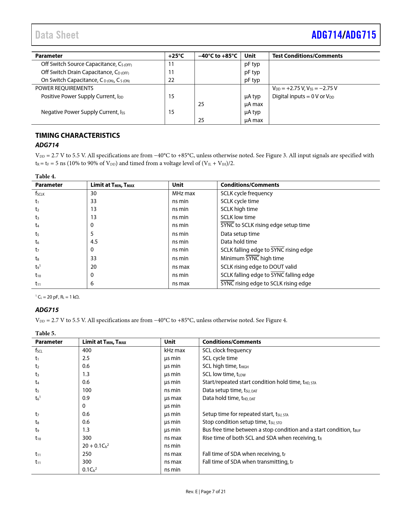 fSCL 400 kHz max SCL clock frequency t1 2.5 µs min SCL cycle time t2 0.6 µs min SCL high time, tHIGH t3 1.3 µs min SCL low time, tLOW t4 0.6 µs min Start/repeated start condition hold time, tHD, STA t5 100 ns min Data setup time, tSU, DAT t 1 6 0.9 µs max Data hold time, tHD, DAT 0 µs min t7 0.6 µs min Setup time for repeated start, tSU, STA t8 0.6 µs min Stop condition setup time, tSU, STO t9 1.3 µs min Bus free time between a stop condition and a start condition, tBUF t10 300 ns max Rise time of both SCL and SDA when receiving, tR 20 + 0.1C 2 b ns min t11 250 ns max Fall time of SDA when receiving, tF t11 300 ns max Fall time of SDA when transmitting, tF 0.1C 2 b ns min Rev. E | Page 7 of 21 Document Outline Features Applications General Description Functional Block Diagrams Product Highlights Revision History Specifications 5 V Single Supply 3 V Single Supply ±2.5 V Dual Supply Timing Characteristics ADG714 ADG715 Timing Diagrams Absolute Maximum Ratings Thermal Resistance ESD Caution Pin Configurations and Function Descriptions Typical Performance Characteristics Terminology Theory of Operation Power-On Reset Serial Interface 3-Wire Serial Interface 2-Wire Serial Interface Input Shift Register Write Operation Read Operation Applications Information Multiple Devices on One Bus Daisy-Chaining Multiple ADG714 Devices Power Supply Sequencing Decoding Multiple ADG714 Devices Using the ADG739 Outline Dimensions Ordering Guide