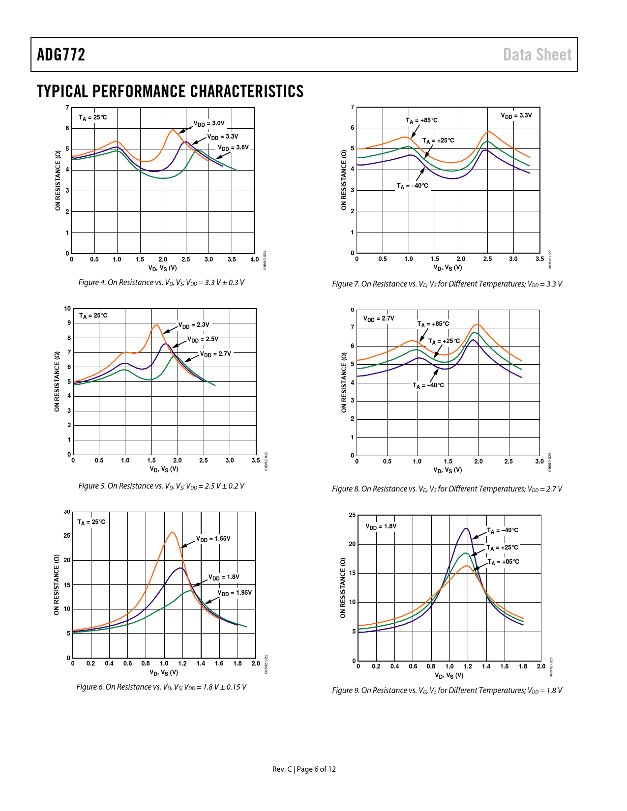 ADG772Data SheetTYPICAL PERFORMANCE CHARACTERISTICS77TVA = 25°CDD = 3.3VTVA = +85°CDD = 3.0V66VDD = 3.3VTA = +25°C5)VDD = 3.6V5)(Ω(Ω44SISTANCETA = –40°C3SISTANCE 3RERENNOO221100 024 027 00.51.01.52.02.53.03.54.000.51.01.52.02.53.03.5VVD, VS (V) 06692- D, VS (V) 06692- Figure 4. On Resistance vs. VD, VS; VDD = 3.3 V ± 0.3 V Figure 7. On Resistance vs. VD, VS for Different Temperatures; VDD = 3.3 V 108TA = 25°CV9DD = 2.7VVTDD = 2.3V7A = +85°C8VDD = 2.5VTA = +25°C6) 7V)(ΩDD = 2.7V(Ω6554TSISTANCESISTANCEA = –40°C4REREN3ON3O22110 023 000.51.01.52.02.53.03.5 026 00.51.01.52.02.53.0VD, VS (V) 06692- VD, VS (V) 06692- Figure 5. On Resistance vs. VD, VS; VDD = 2.5 V ± 0.2 V Figure 8. On Resistance vs. VD, VS for Different Temperatures; VDD = 2.7 V 3025TA = 25°CVDD = 1.8VTA = –40°C25VDD = 1.65V20TA = +25°C))20(Ω(ΩTA = +85°C15VDD = 1.8V15SISTANCEVDD = 1.95VSISTANCERE10NRE10ON O550 022 00.20.40.60.81.01.21.41.61.82.00 025 00.20.40.60.81.01.21.41.61.82.0VD, VS (V) 06692- VD, VS (V) 06692- Figure 6. On Resistance vs. VD, VS; VDD = 1.8 V ± 0.15 V Figure 9. On Resistance vs. V D, VS for Different Temperatures; VDD = 1.8 V Rev. C | Page 6 of 12 Document Outline FEATURES APPLICATIONS FUNCTIONAL BLOCK DIAGRAM GENERAL DESCRIPTION PRODUCT HIGHLIGHTS REVISION HISTORY ABSOLUTE MAXIMUM RATINGS ESD CAUTION PIN CONFIGURATION AND FUNCTION DESCRIPTIONS TRUTH TABLE TYPICAL PERFORMANCE CHARACTERISTICS TEST CIRCUITS TERMINOLOGY OUTLINE DIMENSIONS ORDERING GUIDE