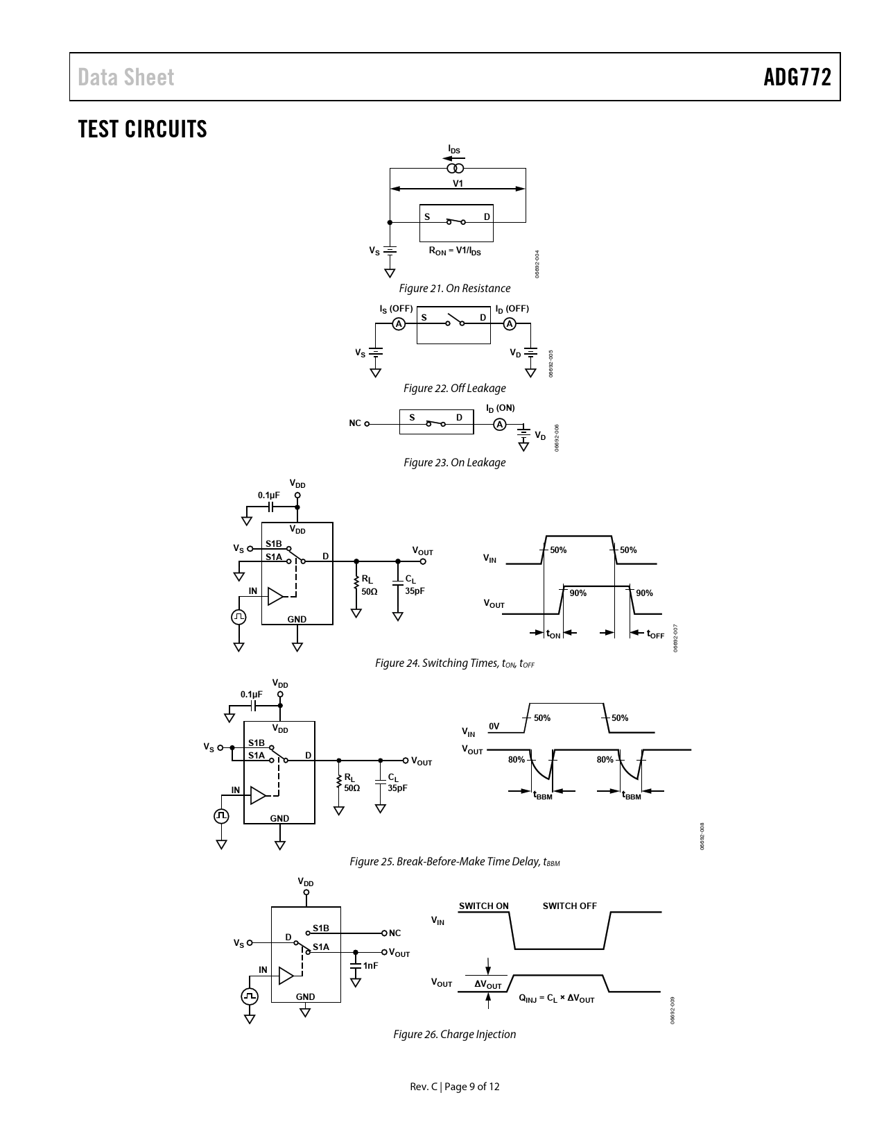 Data Sheet. ADG772. TEST CIRCUITS. IDS. RON = V1/IDS. IS (OFF). ID (OFF). ID (ON). VDD. 0.1µF. S1B. 50%. S1A. OUT. VIN. 50Ω. 35pF. 90%. VOUT. GND. tON. tOFF. 80%