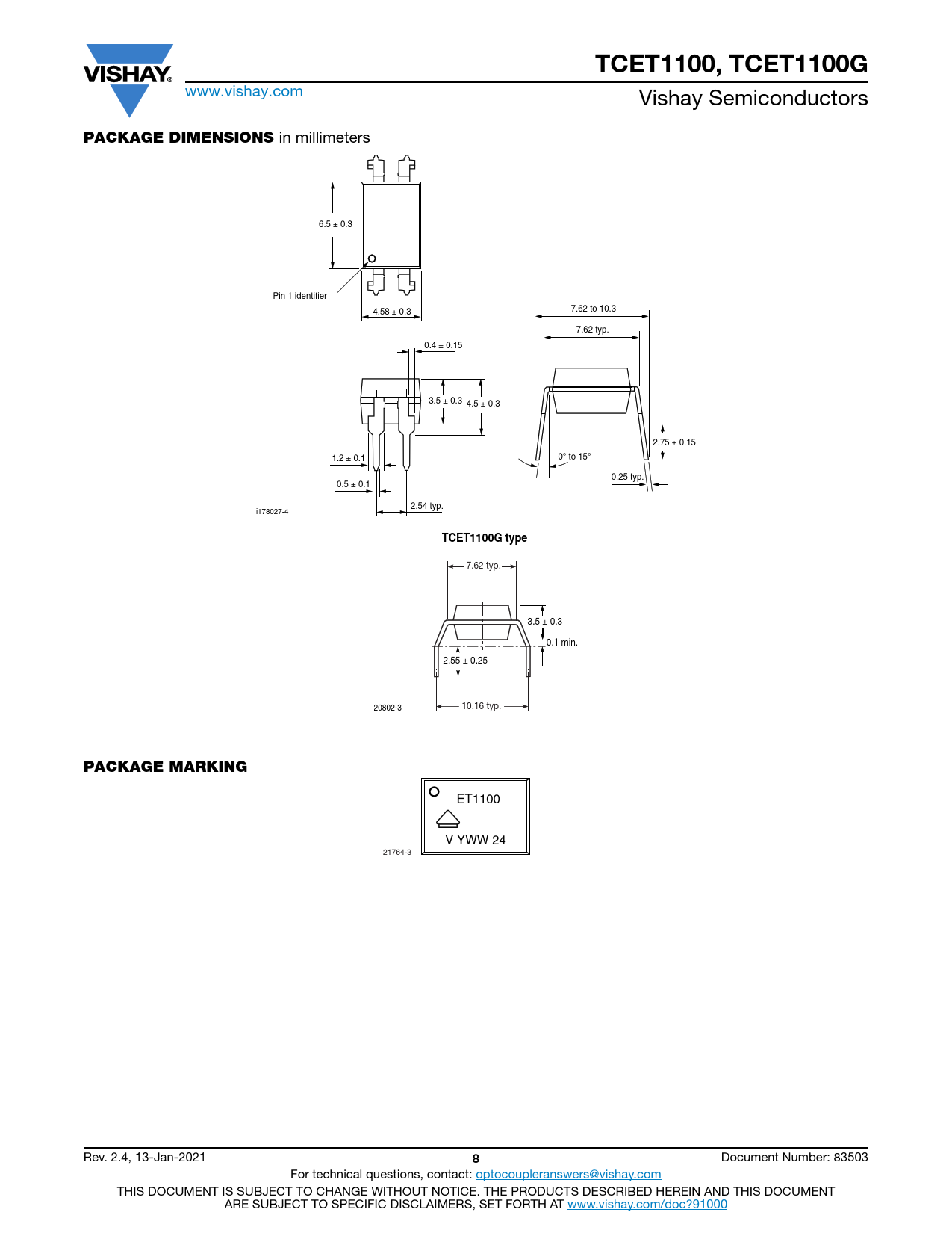 TCET1100, TCET1100G. PACKAGE DIMENSIONS. TCET1100G type. PACKAGE MARKING