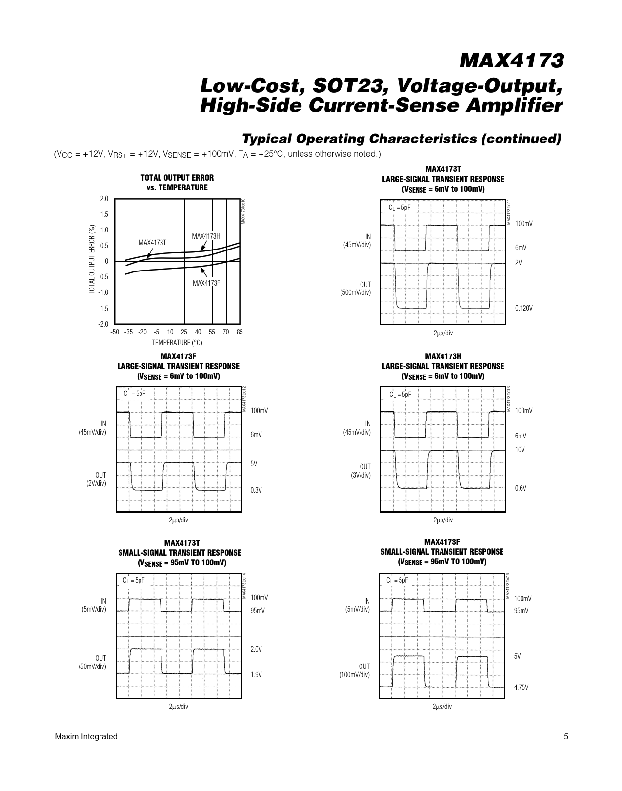 2.0 CL = 5pF 1.5 MAX4173 toc10 MAX4173 toc11 100mV 1.0 MAX4173H IN 0.5 MAX4173T (45mV/div) 6mV 0 2V -0.5 MAX4173F OUT TOTAL OUTPUT ERROR (%) -1.0 (500mV/div) -1.5 0.120V -2.0 -50 -35 -20 -5 10 25 40 55 70 85 2µs/div TEMPERATURE (°C)