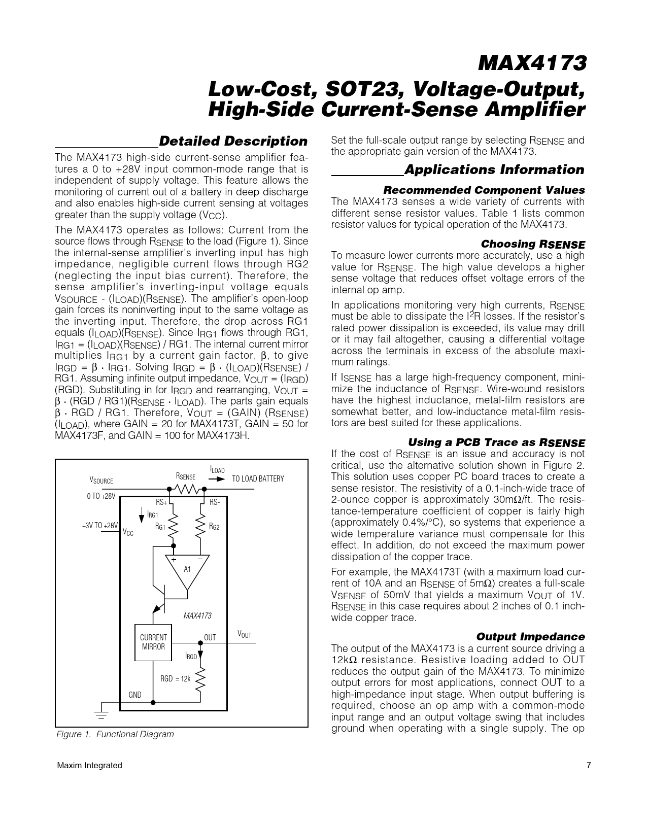 Set the full-scale output range by selecting RSENSE and the appropriate gain version of the MAX4173. The MAX4173 high-side current-sense amplifier fea- tures a 0 to +28V input common-mode range that is