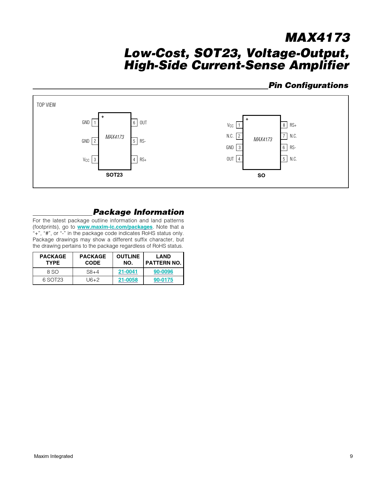 MAX4173 Low-Cost, SOT23, Voltage-Output,High-Side Current-Sense AmplifierPin Configurations TOP VIEW ++ GND 1 6 OUT VCC 1 8 RS+ N.C. 2 7 N.C. MAX4173 MAX4173 GND 2 5 RS- GND 3 6 RS- VCC 3 4 RS+ OUT 4 5 N.C. SOT23SOPackage Information For the latest package outline information and land patterns (footprints), go to www.maxim-ic.com/packages . Note that a “+”, “#”, or “-” in the package code indicates RoHS status only. Package drawings may show a different suffix character, but the drawing pertains to the package regardless of RoHS status. PACKAGEPACKAGEOUTLINELANDTYPECODENO.PATTERN NO. 8 SO S8+4 21-004190-0096 6 SOT23 U6+2 21-005890-0175 Maxim Integrated 9