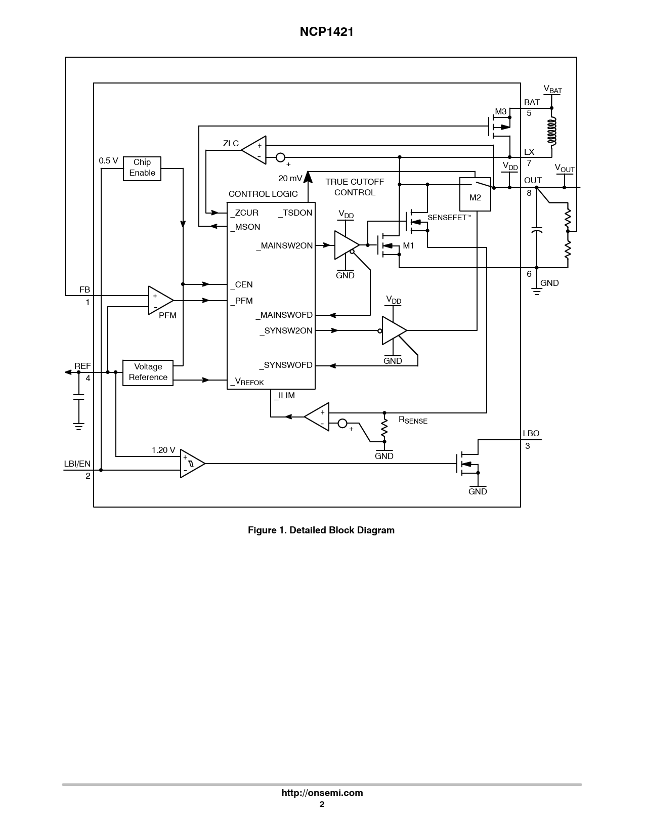 VBAT BAT M3 5 ZLC + LX - 0.5 V Chip + V 7 DD V Enable OUT 20 mV TRUE CUTOFF OUT CONTROL LOGIC CONTROL 8 M2 _ZCUR _TSDON VDD SENSEFETt _MSON _MAINSW2ON M1 GND 6 _CEN GND FB + 1 _PFM VDD - PFM _MAINSWOFD _SYNSW2ON REF GND Voltage _SYNSWOFD 4 Reference _VREFOK _ILIM + R - SENSE + LBO 3 1.20 V + GND LBI/EN 2 - GND