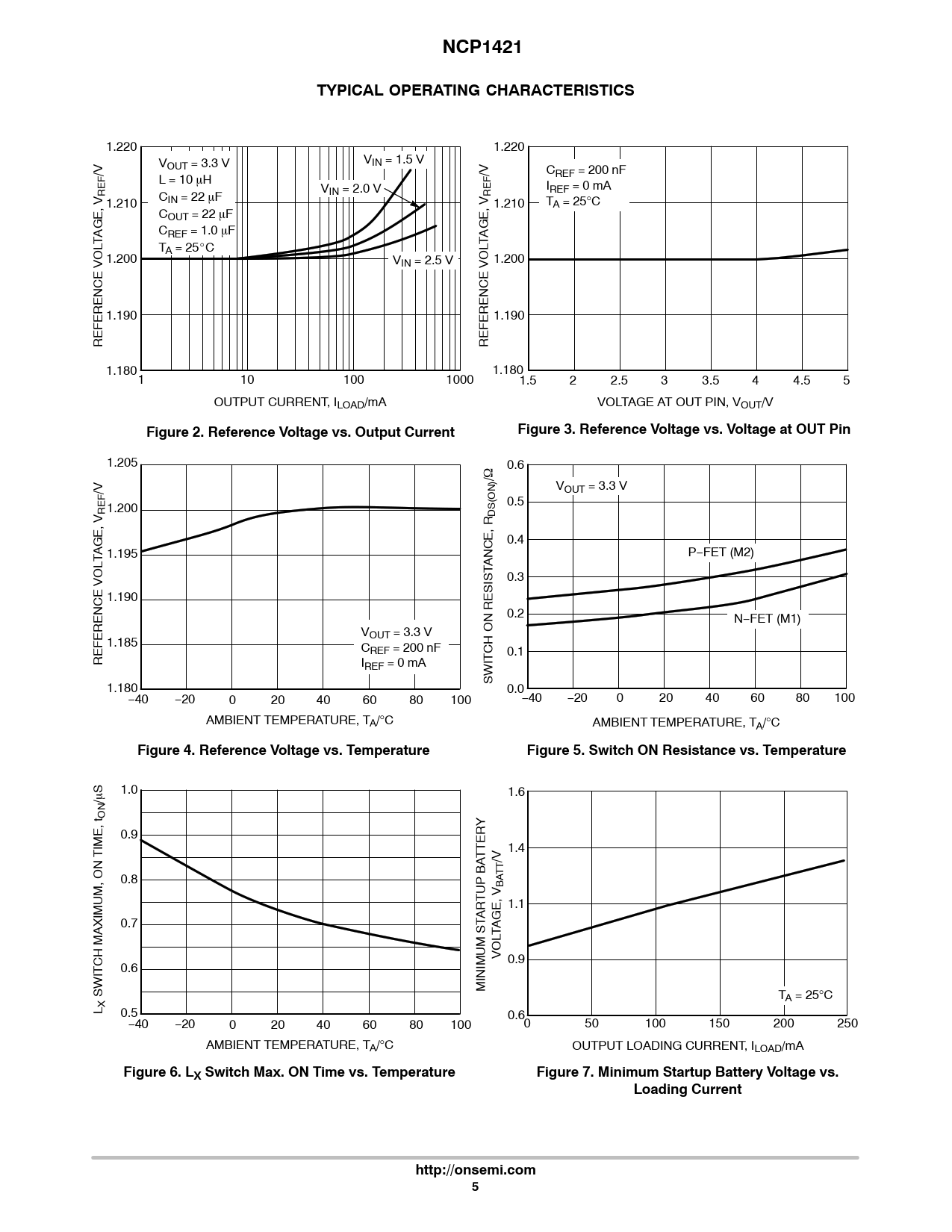 NCP1421TYPICAL OPERATING CHARACTERISTICS 1.220 1.220 V V OUT = 3.3 V IN = 1.5 V /V /V C F L = 10 H REF = 200 nF F I RE VIN = 2.0 V REF = 0 mA RE 1.210 CIN = 22 F 1.210 TA = 25°C COUT = 22 F GE, V C GE, V REF = 1.0 F TA T TA A = 25_C 1.200 VIN = 2.5 V 1.200 1.190 1.190 REFERENCE VOL REFERENCE VOL 1.180 1.180 1 10 100 1000 1.5 2 2.5 3 3.5 4 4.5 5 OUTPUT CURRENT, ILOAD/mA VOLTAGE AT OUT PIN, VOUT/V Figure 2. Reference Voltage vs. Output CurrentFigure 3. Reference Voltage vs. Voltage at OUT Pin 1.205 0.6 / N) V /V OUT = 3.3 V F (O RE 1.200 0.5 DS 0.4 1.195 P−FET (M2) TAGE, V ANCE, R 0.3 1.190 0.2 N−FET (M1) V 1.185 OUT = 3.3 V CREF = 200 nF 0.1 REFERENCE VOL IREF = 0 mA SWITCH ON RESIST 1.180 0.0 −40 −20 0 20 40 60 80 100 −40 −20 0 20 40 60 80 100 AMBIENT TEMPERATURE, TA/°C AMBIENT TEMPERATURE, TA/°C Figure 4. Reference Voltage vs. TemperatureFigure 5. Switch ON Resistance vs. Temperature 1.0 1.6 /S ON Y 0.9 1.4 TTER /V TT 0.8 BA TUP BA R 1.1 A 0.7 LTAGE, V O V 0.9 0.6 MINIMUM ST SWITCH MAXIMUM, ON TIME, t TA = 25°C L X 0.5 0.6 −40 −20 0 20 40 60 80 100 0 50 100 150 200 250 AMBIENT TEMPERATURE, TA/°C OUTPUT LOADING CURRENT, ILOAD/mA Figure 6. LX Switch Max. ON Time vs. TemperatureFigure 7. Minimum Startup Battery Voltage vs.Loading Currenthttp://onsemi.com5
