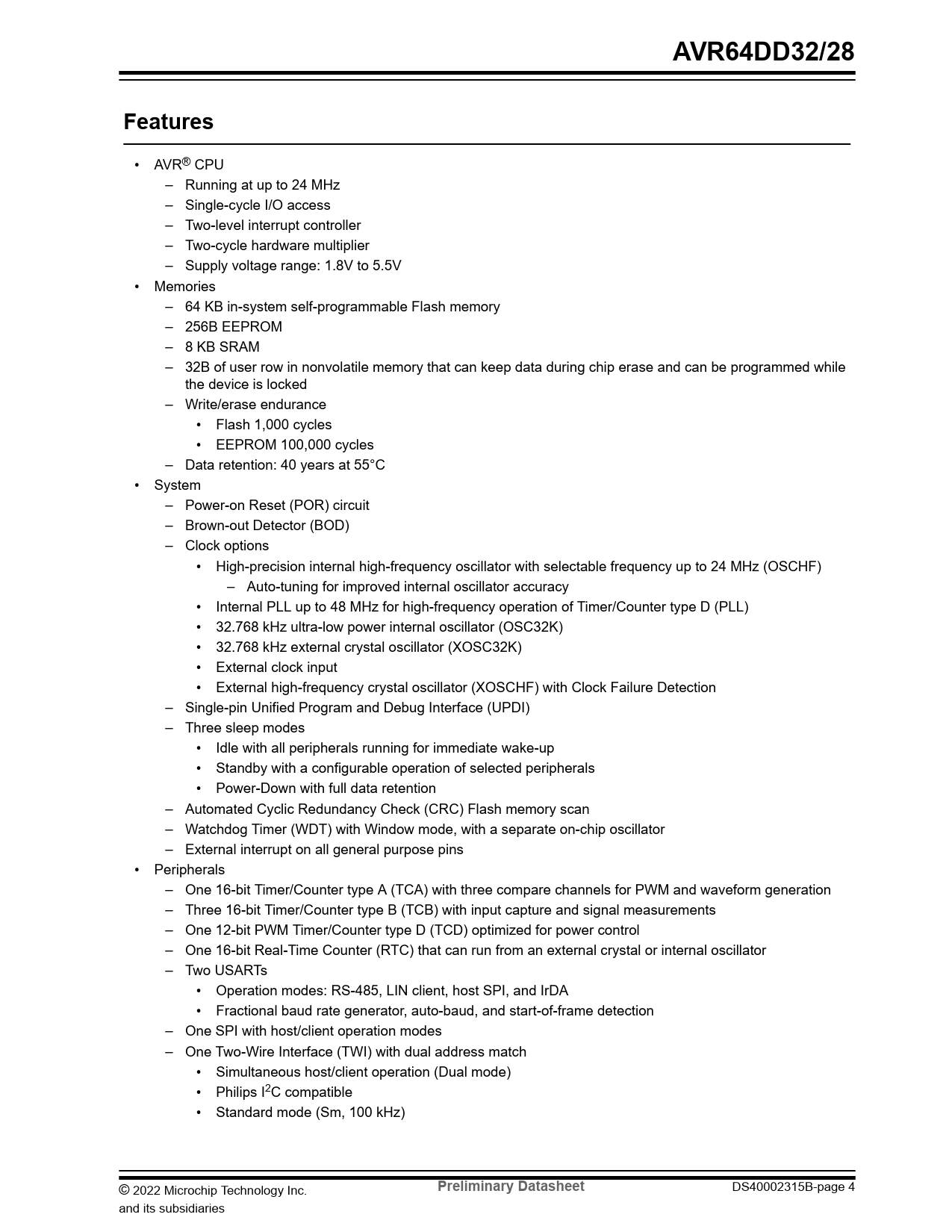 | Seiten / Seite | 614 / 4 — AVR64DD32/28. Features. Preliminary Datasheet |
