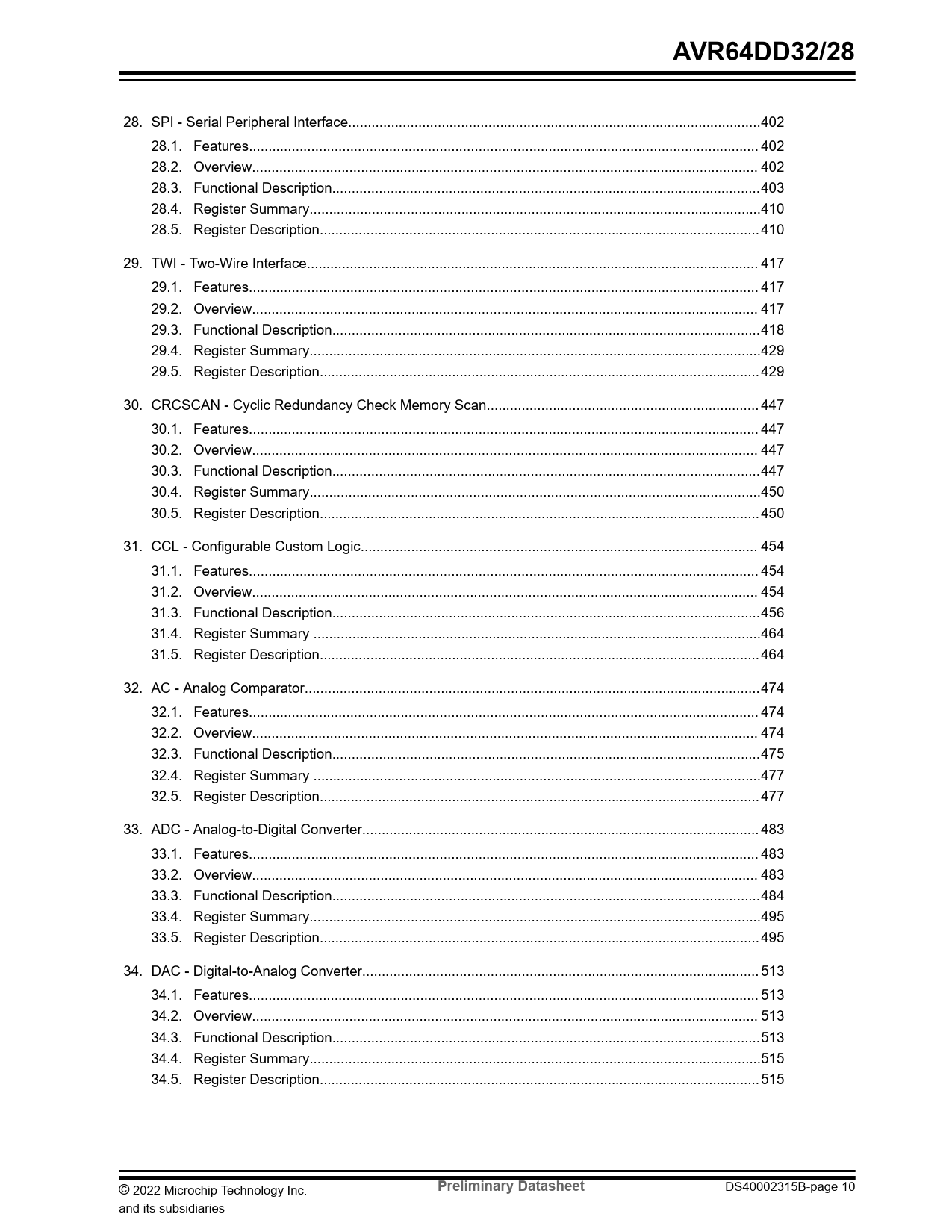 28. SPI - Serial Peripheral Interface..402 28.1. Features... 402 28.2. Overview.. 402 28.3. Functional Description..403 28.4. Register Summary..410 28.5. Register Description... 410 29. TWI - Two-Wire Interface.. 417 29.1. Features... 417 29.2. Overview.. 417 29.3. Functional Description..418 29.4. Register Summary..429 29.5. Register Description... 429 30. CRCSCAN - Cyclic Redundancy Check Memory Scan.. 447 30.1. Features... 447 30.2. Overview.. 447 30.3. Functional Description..447 30.4. Register Summary..450 30.5. Register Description... 450 31. CCL - Configurable Custom Logic.. 454 31.1. Features... 454 31.2. Overview.. 454 31.3. Functional Description..456 31.4. Register Summary ...464 31.5. Register Description... 464 32. AC - Analog Comparator...474 32.1. Features... 474 32.2. Overview.. 474 32.3. Functional Description..475 32.4. Register Summary ...477 32.5. Register Description... 477 33. ADC - Analog-to-Digital Converter.. 483 33.1. Features... 483 33.2. Overview.. 483 33.3. Functional Description..484 33.4. Register Summary..495 33.5. Register Description... 495 34. DAC - Digital-to-Analog Converter.. 513 34.1. Features... 513 34.2. Overview.. 513 34.3. Functional Description..513 34.4. Register Summary..515 34.5. Register Description... 515 © 2022 Microchip Technology Inc.