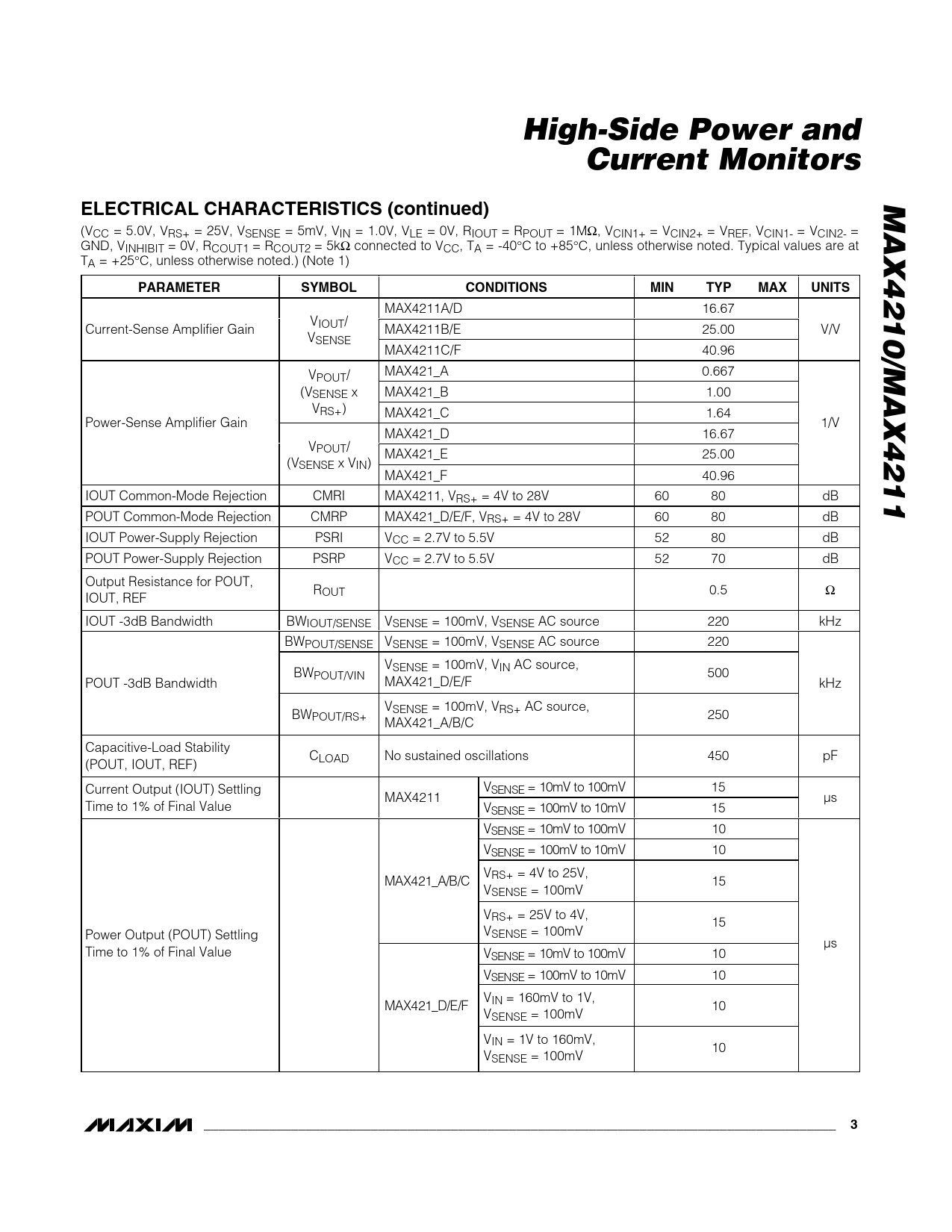 High-Side Power and. Current Monitors. MAX4210/MAX4211. ELECTRICAL CHARACTERISTICS (continued). PARAMETER. SYMBOL. CONDITIONS. MIN. TYP