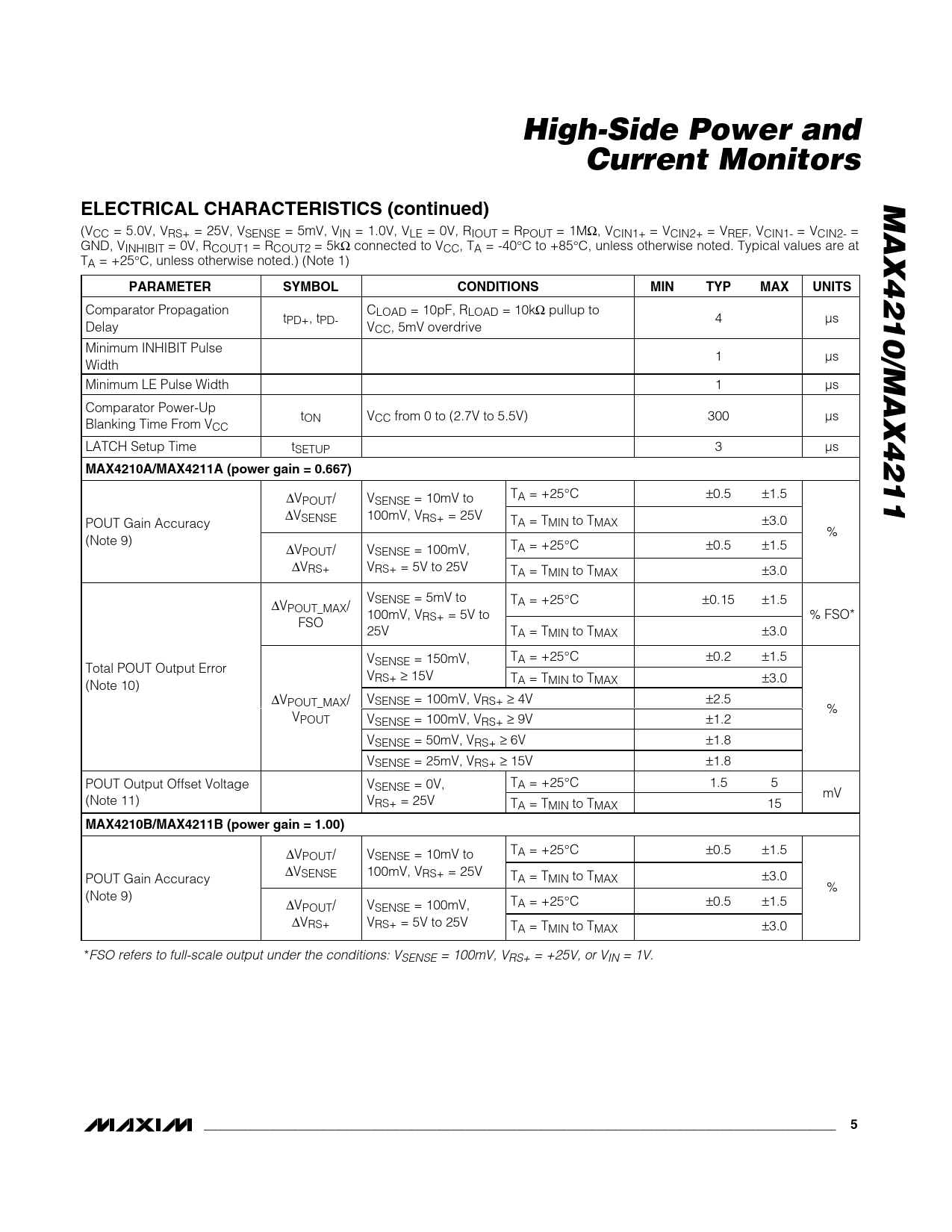 High-Side Power andCurrent MonitorsMAX4210/MAX4211ELECTRICAL CHARACTERISTICS (continued) (VCC = 5.0V, VRS+ = 25V, VSENSE = 5mV, VIN = 1.0V, VLE = 0V, RIOUT = RPOUT = 1MΩ, VCIN1+ = VCIN2+ = VREF, VCIN1- = VCIN2- = GND, VINHIBIT = 0V, RCOUT1 = RCOUT2 = 5kΩ connected to VCC, TA = -40°C to +85°C, unless otherwise noted. Typical values are at TA = +25°C, unless otherwise noted.) (Note 1) PARAMETERSYMBOLCONDITIONSMINTYPMAXUNITS Comparator Propagation C t LOAD = 10pF, RLOAD = 10kΩ pullup to PD+, tPD- 4 µs Delay VCC, 5mV overdrive Minimum INHIBIT Pulse 1 µs Width Minimum LE Pulse Width 1 µs Comparator Power-Up tON VCC from 0 to (2.7V to 5.5V) 300 µs Blanking Time From VCC LATCH Setup Time tSETUP 3 µs MAX4210A/MAX4211A (power gain = 0.667) TA = +25°C ±0.5 ±1.5 ∆VPOUT/ VSENSE = 10mV to ∆VSENSE 100mV, VRS+ = 25V T POUT Gain Accuracy A = TMIN to TMAX ±3.0 % (Note 9) TA = +25 V °C ±0.5 ±1.5 ∆VPOUT/ SENSE = 100mV, ∆VRS+ VRS+ = 5V to 25V TA = TMIN to TMAX ±3.0 VSENSE = 5mV to TA = +25°C ±0.15 ±1.5 ∆VPOUT_MAX/ 100mV, VRS+ = 5V to % FSO* FSO 25V TA = TMIN to TMAX ±3.0 V TA = +25 SENSE = 150mV, °C ±0.2 ±1.5 Total POUT Output Error VRS+ ≥ 15V TA = TMIN to TMAX ±3.0 (Note 10) ∆V V POUT_MAX/ SENSE = 100mV, VRS+ ≥ 4V ±2.5 % VPOUT VSENSE = 100mV, VRS+ ≥ 9V ±1.2 VSENSE = 50mV, VRS+ ≥ 6V ±1.8 VSENSE = 25mV, VRS+ ≥ 15V ±1.8 POUT Output Offset Voltage V T SENSE = 0V, A = +25°C 1.5 5 mV (Note 11) VRS+ = 25V TA = TMIN to TMAX 15 MAX4210B/MAX4211B (power gain = 1.00) TA = +25°C ±0.5 ±1.5 ∆VPOUT/ VSENSE = 10mV to ∆VSENSE 100mV, VRS+ = 25V T POUT Gain Accuracy A = TMIN to TMAX ±3.0 % (Note 9) TA = +25 V °C ±0.5 ±1.5 ∆VPOUT/ SENSE = 100mV, ∆VRS+ VRS+ = 5V to 25V TA = TMIN to TMAX ±3.0 *FSO refers to full-scale output under the conditions: VSENSE = 100mV, VRS+ = +25V, or VIN = 1V. _______________________________________________________________________________________5