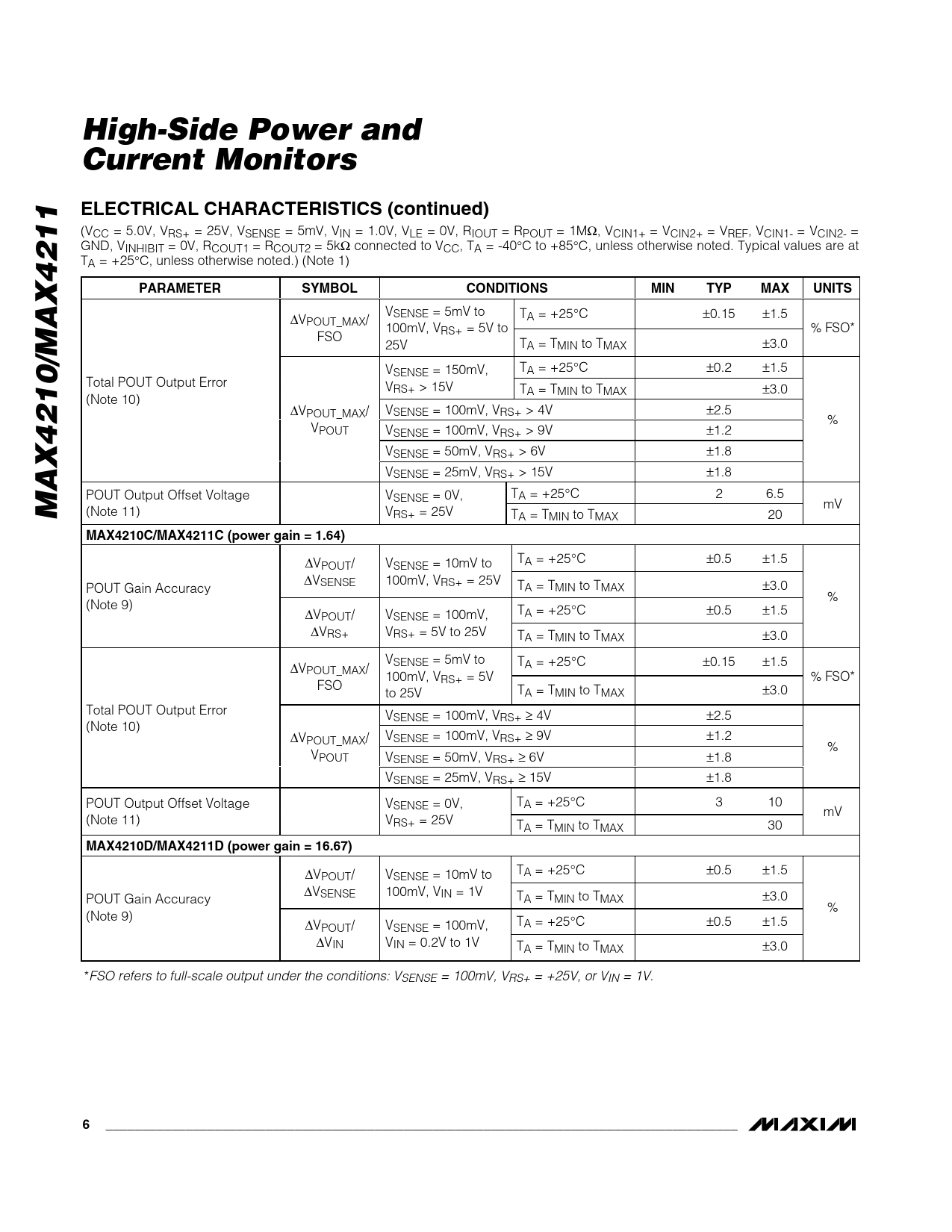 VSENSE = 5mV to TA = +25°C ±0.15 ±1.5 ∆VPOUT_MAX/ 100mV, VRS+ = 5V to % FS O* FSO 25V TA = TMIN to TMAX ±3.0 V TA = +25 SENSE = 150mV, °C ±0.2 ±1.5 Total POUT Output Error VRS+ > 15V TA = TMIN to TMAX ±3.0 (Note 10) ∆V V POUT_MAX/ SENSE = 100mV, VRS+ > 4V ±2.5 % VPOUT VSENSE = 100mV, VRS+ > 9V ±1.2 VSENSE = 50mV, VRS+ > 6V ±1.8 VSENSE = 25mV, VRS+ > 15V ±1.8 POUT Output Offset Voltage V T SENSE = 0V, A = +25°C 2 6.5 mV (Note 11) V