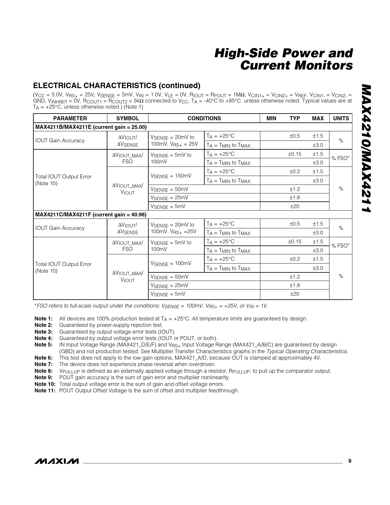 High-Side Power andCurrent MonitorsMAX4210/MAX4211ELECTRICAL CHARACTERISTICS (continued) (VCC = 5.0V, VRS+ = 25V, VSENSE = 5mV, VIN = 1.0V, VLE = 0V, RIOUT = RPOUT = 1MΩ, VCIN1+ = VCIN2+ = VREF, VCIN1- = VCIN2- = GND, VINHIBIT = 0V, RCOUT1 = RCOUT2 = 5kΩ connected to VCC, TA = -40°C to +85°C, unless otherwise noted. Typical values are at TA = +25°C, unless otherwise noted.) (Note 1) PARAMETERSYMBOLCONDITIONSMINTYPMAXUNITSMAX4211B/MAX4211E (current gain = 25.00) T ∆V V A = +25°C ±0.5 ±1.5 IOUT Gain Accuracy IOUT/ SENSE = 20mV to ∆ % VSENSE 100mV, VRS+ = 25V TA = TMIN to TMAX ±3.0 V T SENSE = 5mV to A = +25°C ±0.15 ±1.5 ∆VIOUT_MAX/ % FS O* FSO 100mV TA = TMIN to TMAX ±3.0 TA = +25°C ±0.2 ±1.5 Total IOUT Output Error VSENSE = 150mV TA = TMIN to TMAX ±3.0 (Note 10) ∆VIOUT_MAX/ VSENSE = 50mV ±1.2 % VIOUT VSENSE = 25mV ±1.8 VSENSE = 5mV ±20 MAX4211C/MAX4211F (current gain = 40.96) T ∆V V A = +25°C ±0.5 ±1.5 IOUT Gain Accuracy IOUT/ SENSE = 20mV to ∆ % VSENSE 100mV, VRS+ =25V TA = TMIN to TMAX ±3.0 V T SENSE = 5mV to A = +25°C ±0.15 ±1.5 ∆VIOUT_MAX/ % FS O* FSO 100mV TA = TMIN to TMAX ±3.0 TA = +25°C ±0.2 ±1.5 Total IOUT Output Error VSENSE = 100mV TA = TMIN to TMAX ±3.0 (Note 10) ∆VIOUT_MAX/ VSENSE = 50mV ±1.2 % VIOUT VSENSE = 25mV ±1.8 VSENSE = 5mV ±20 *FSO refers to full-scale output under the conditions: VSENSE = 100mV, VRS+ = +25V, or VIN = 1V. Note 1: All devices are 100% production tested at TA = +25°C. All temperature limits are guaranteed by design. Note 2: Guaranteed by power-supply rejection test. Note 3: Guaranteed by output voltage error tests (IOUT). Note 4: Guaranteed by output voltage error tests (IOUT or POUT, or both). Note 5: IN Input Voltage Range (MAX421_D/E/F) and VRS+ Input Voltage Range (MAX421_A/B/C) are guaranteed by design (GBD) and not production tested. See Multiplier Transfer Characteristics graphs in the Typical Operating Characteristics. Note 6: This test does not apply to the low gain options, MAX421_A/D, because OUT is clamped at approximately 4V. Note 7: The device does not experience phase reversal when overdriven. Note 8: VPULLUP is defined as an externally applied voltage through a resistor, RPULLUP, to pull up the comparator output. Note 9: POUT gain accuracy is the sum of gain error and multiplier nonlinearity. Note 10: Total output voltage error is the sum of gain and offset voltage errors. Note 11: POUT Output Offset Voltage is the sum of offset and multiplier feedthrough. _______________________________________________________________________________________9