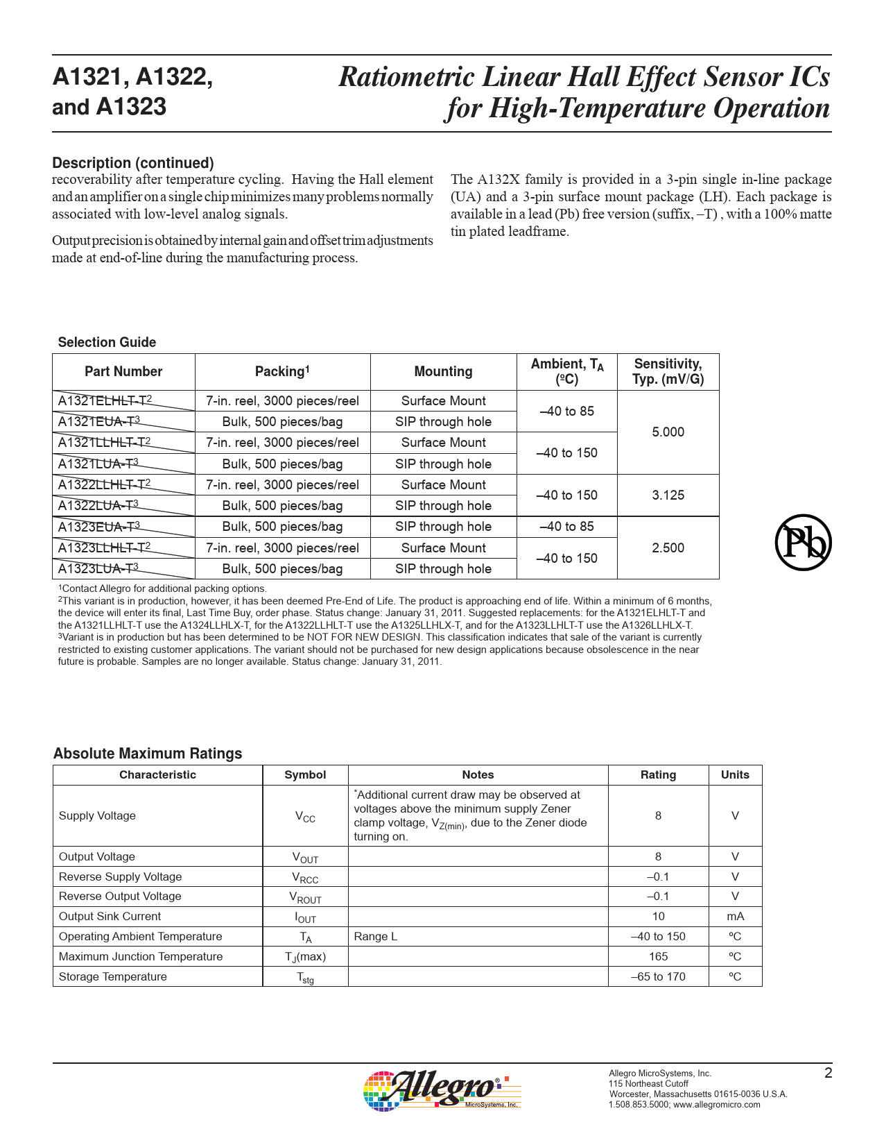 A1321ELHLT-T2 7-in. reel, 3000 pieces/reel Surface Mount –40 to 85 A1321EUA-T3 Bulk, 500 pieces/bag SIP through hole 5.000 A1321LLHLT-T2 7-in. reel, 3000 pieces/reel Surface Mount –40 to 150 A1321LUA-T3 Bulk, 500 pieces/bag SIP through hole A1322LLHLT-T2 7-in. reel, 3000 pieces/reel Surface Mount –40 to 150 3.125 A1322LUA-T3 Bulk, 500 pieces/bag SIP through hole A1323EUA-T3 Bulk, 500 pieces/bag SIP through hole –40 to 85 A1323LLHLT-T2 7-in. reel, 3000 pieces/reel Surface Mount 2.500 –40 to 150 A1323LUA-T3 Bulk, 500 pieces/bag SIP through hole 1Contact Allegro for additional packing options. 2This variant is in production, however, it has been deemed Pre-End of Life. The product is approaching end of life. Within a minimum of 6 months, the device will enter its final, Last Time Buy, order phase. Status change: January 31, 2011. Suggested replacements: for the A1321ELHLT-T and the A1321LLHLT-T use the A1324LLHLX-T, for the A1322LLHLT-T use the A1325LLHLX-T, and for the A1323LLHLT-T use the A1326LLHLX-T. 3Variant is in production but has been determined to be NOT FOR NEW DESIGN. This classification indicates that sale of the variant is currently restricted to existing customer applications. The variant should not be purchased for new design applications because obsolescence in the near future is probable. Samples are no longer available. Status change: January 31, 2011.