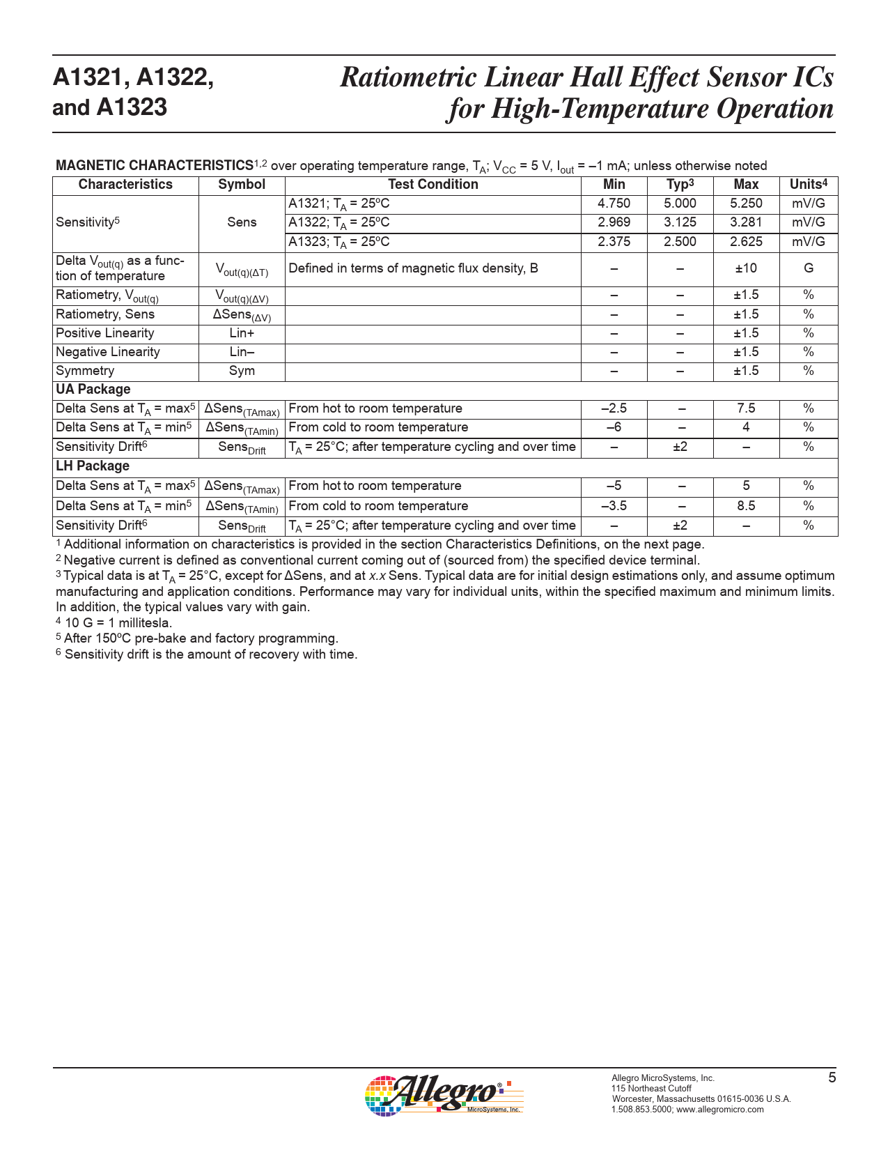 A1321, A1322,. Ratiometric Linear Hall Effect Sensor ICs. and A1323. for High-Temperature Operation. MAGNETIC CHARACTERISTICS
