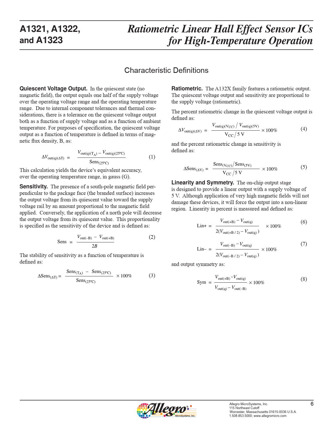 A1321, A1322,Ratiometric Linear Hall Effect Sensor ICsand A1323for High-Temperature Operation Characteristic Defi nitions Quiescent Voltage Output. In the quiescent state (no Ratiometric. The A132X family features a ratiometric output. magnetic fi eld), the output equals one half of the supply voltage The quiescent voltage output and sensitivity are proportional to over the operating voltage range and the operating temperature the supply voltage (ratiometric). range. Due to internal component tolerances and thermal con- The percent ratiometric change in the quiescent voltage output is siderations, there is a tolerance on the quiescent voltage output defi ned as: both as a function of supply voltage and as a function of ambient temperature. For purposes of specifi cation, the quiescent voltage Vout(q)(VCC) Vout(q)(5V) ΔV (4) output as a function of temperature is defi ned in terms of mag- out(q)(ΔV) = × 100% VCC 5 V netic fl ux density, B, as: and the percent ratiometric change in sensitivity is defi ned as: V – Δ out(q)(ΤΑ) Vout(q)(25ºC) Vout(q)(ΔΤ) = (1) Sens(25ºC) Sens(VCC) Sens(5V) (5) This calculation yields the device’s equivalent accuracy, ΔSens( = ΔV) × 100% V over the operating temperature range, in gauss (G). CC 5 V Linearity and Symmetry. The on-chip output stage Sensitivity. The presence of a south-pole magnetic fi eld per- is designed to provide a linear output with a supply voltage of pendicular to the package face (the branded surface) increases 5 V. Although application of very high magnetic fi elds will not the output voltage from its quiescent value toward the supply damage these devices, it will force the output into a non-linear voltage rail by an amount proportional to the magnetic fi eld region. Linearity in percent is measured and defi ned as: applied. Conversely, the application of a north pole will decrease the output voltage from its quiescent value. This proportionality V – out(+B) Vout(q) (6) is specifi ed as the sensitivity of the device and is defi ned as: Lin+ = × 100% 2(Vout(+B / 2) – Vout(q) – Vout(–B) Vout(+B) (2) Sens = 2 V – (7) B out(–B) Vout(q) Lin– = × 100% The stability of sensitivity as a function of temperature is 2(Vout(–B / 2) – Vout(q) defi ned as: and output symmetry as: Sens – Δ (ΤΑ) Sens(25ºC) Sens (3) (ΔΤ) = × 100% V –V Sens out(+B) out(q) (8) (25ºC) Sym = × 100% Vout(q) – Vout(–B) Allegro MicroSystems, Inc. 6 115 Northeast Cutoff Worcester, Massachusetts 01615-0036 U.S.A. 1.508.853.5000; www.allegromicro.com