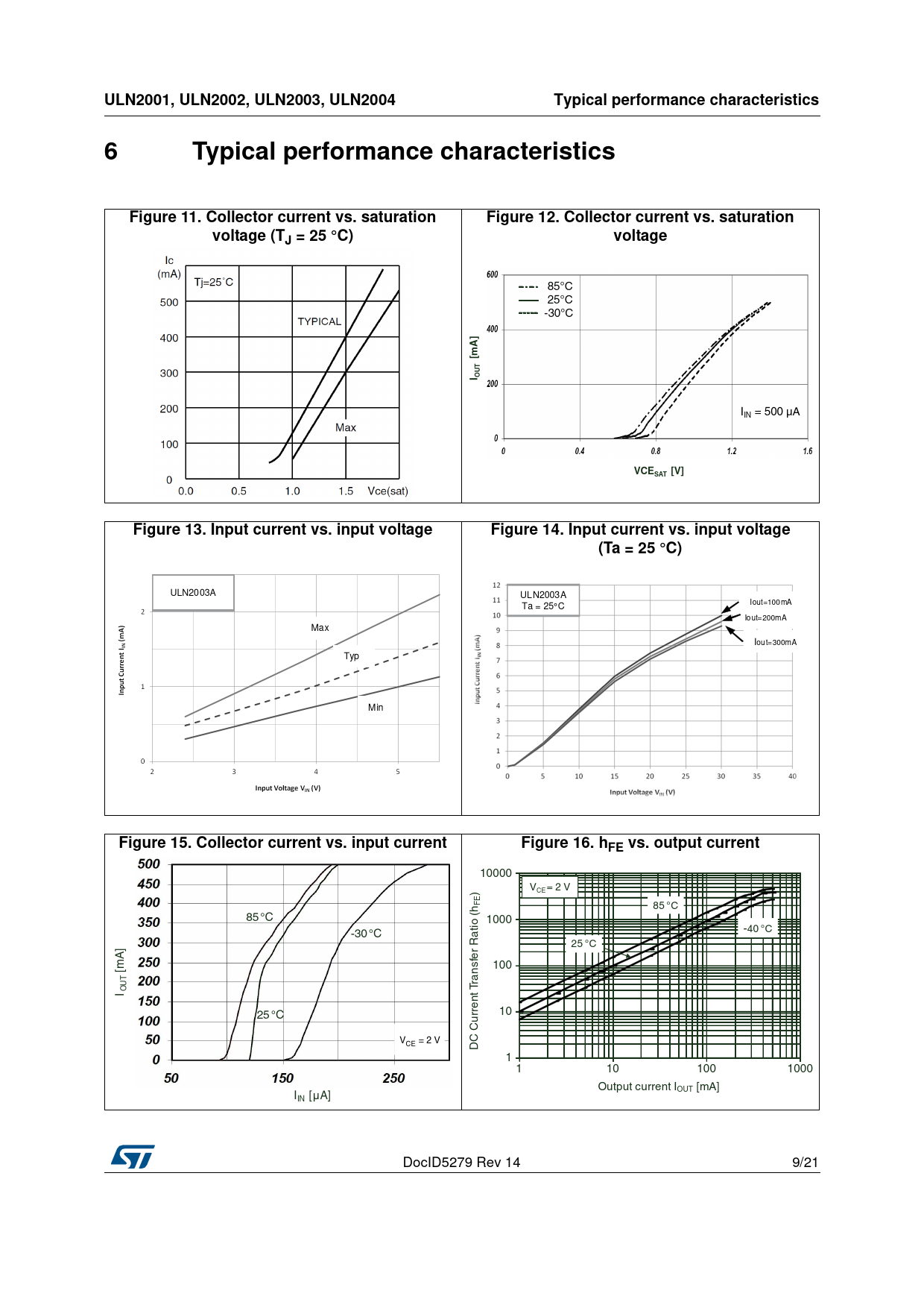 ULN2001, ULN2002, ULN2003, ULN2004Typical performance characteristics6Typical performance characteristicsFigure 11. Collector current vs. saturationFigure 12. Collector current vs. saturationvoltage (TJ = 25 °C)voltage 85°C 25°C -30°C ] A [m TUIO IIN = 500 µA VCESAT [V]Figure 13. Input current vs. input voltageFigure 14. Input current vs. input voltage(Ta = 25 °C) ULN2003A ULN2003A Ta = 25°C Iout=100 mA Io ut=200mA Max Iout=300mA Typ Min Figure 15. Collector current vs. input currentFigure 16. hFE vs. output current 10000 ) V = 2 V CE E F 85 °C 85 °C (h 1000 tio -30 °C - a 40 °C R ] r 25 °C A fe [m s 100 n T U ra I O t T n 25 °C rre 10 u C V C CE = 2 V D 1 1 10 100 1000 Output current IOUT [mA] IIN [μA] DocID5279 Rev 14 9/21 21 Document Outline 1 Diagram Figure 1. Schematic diagram 2 Pin configuration Figure 2. Pin connections (top view) 3 Maximum ratings Table 1. Absolute maximum ratings Table 2. Thermal data 4 Electrical characteristics Table 3. Electrical characteristics 5 Test circuits Figure 3. Output leakage current Figure 4. Output leakage current (for ULN2002 only) Figure 5. Collector-emitter saturation voltage Figure 6. Input current (ON) Figure 7. Input current (OFF) Figure 8. Input voltage Figure 9. Clamp diode leakage current Figure 10. Clamp diode forward voltage 6 Typical performance characteristics Figure 11. Collector current vs. saturation voltage (TJ = 25 °C) Figure 12. Collector current vs. saturation voltage Figure 13. Input current vs. input voltage Figure 14. Input current vs. input voltage (Ta = 25 °C) Figure 15. Collector current vs. input current Figure 16. hFE vs. output current Figure 17. Peak collector current vs. duty cycle (DIP-16) Figure 18. Peak collector current vs. duty cycle (SO-16) 7 Package information 7.1 DIP-16L package information Figure 19. DIP-16L package outline Table 4. DIP-16L mechanical data 7.2 SO-16 Narrow package information Figure 20. SO-16 package outline Table 5. SO-16 Narrow mechanical data Figure 21. SO-16 Narrow tape and reel drawing Table 6. SO-16 Narrow tape and reel mechanical data 7.3 TSSOP16 package information Figure 22. TSSOP16 package outline Table 7. TSSOP16 mechanical data Figure 23. TSSOP16 recommended footprint (dimensions are in mm) Figure 24. TSSOP16 tape and reel drawing Table 8. TSSOP16 tape and reel mechanical data 8 Order codes Table 9. Order codes 9 Revision history Table 10. Revision history