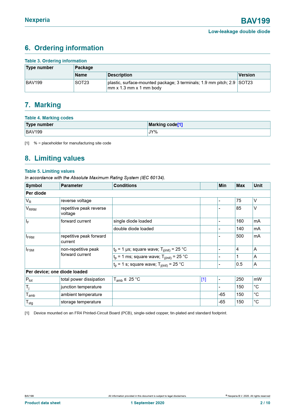 | Seiten / Seite | 10 / 2 — Nexperia. BAV199. Low-leakage double diode. 6. Ordering information Table … |