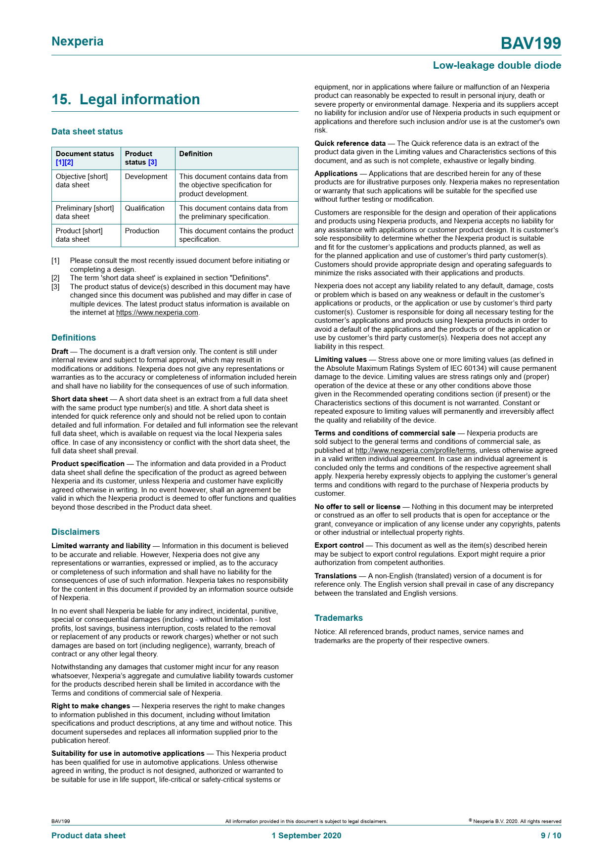 | Seiten / Seite | 10 / 9 — Nexperia. BAV199. Low-leakage double diode. 15. Legal information. Data … |