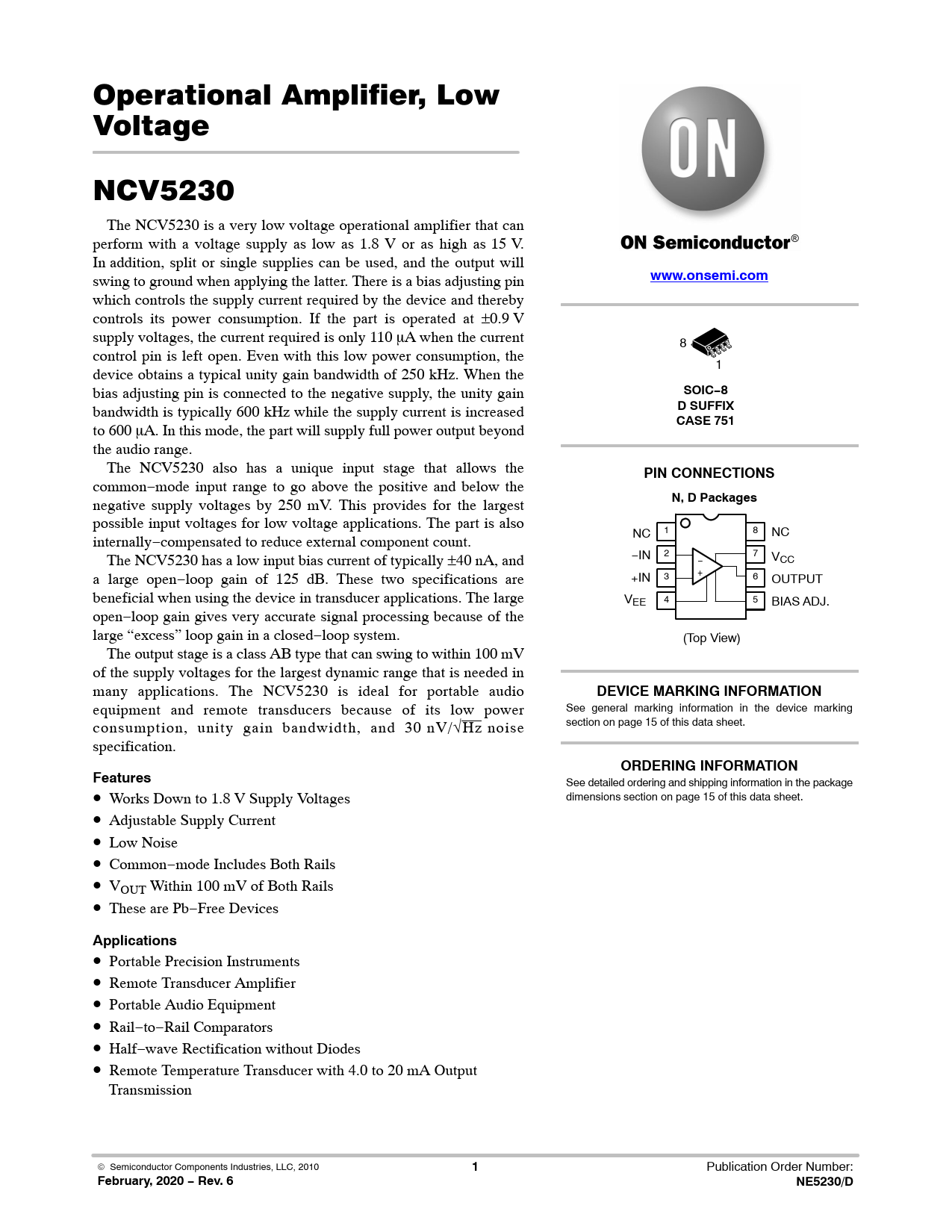 link to page 15 link to page 15 Operational Amplifier, Low Voltage NCV5230 The NCV5230 is a very low voltage operational amplifier that can perform with a voltage supply as low as 1.8 V or as high as 15 V. In addition, split or single supplies can be used, and the output will swing to ground when applying the latter. There is a bias adjusting pin