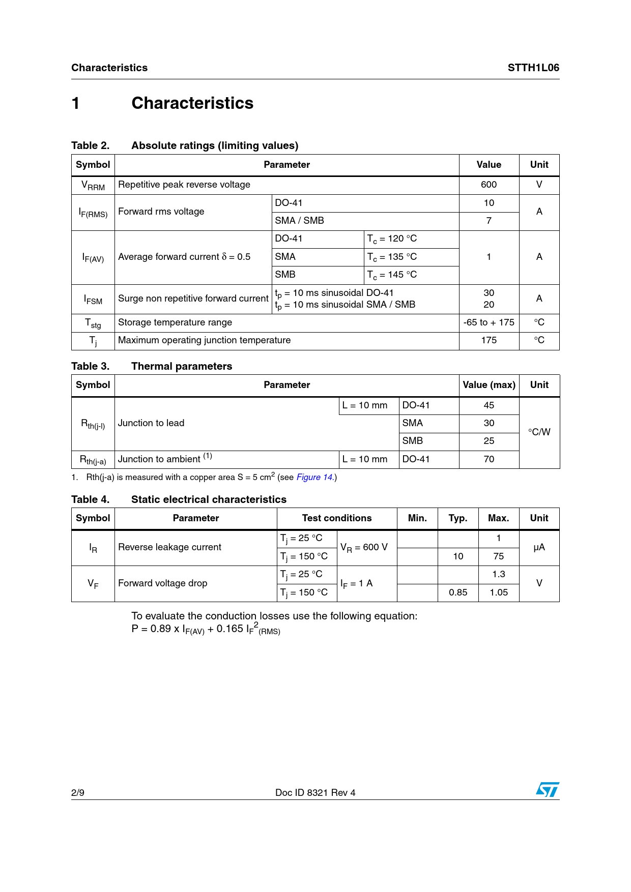 Characteristics STTH1L06 1 Characteristics Table 2 Absolute ratings (limiting values) Symbol Parameter Value Unit Table 3