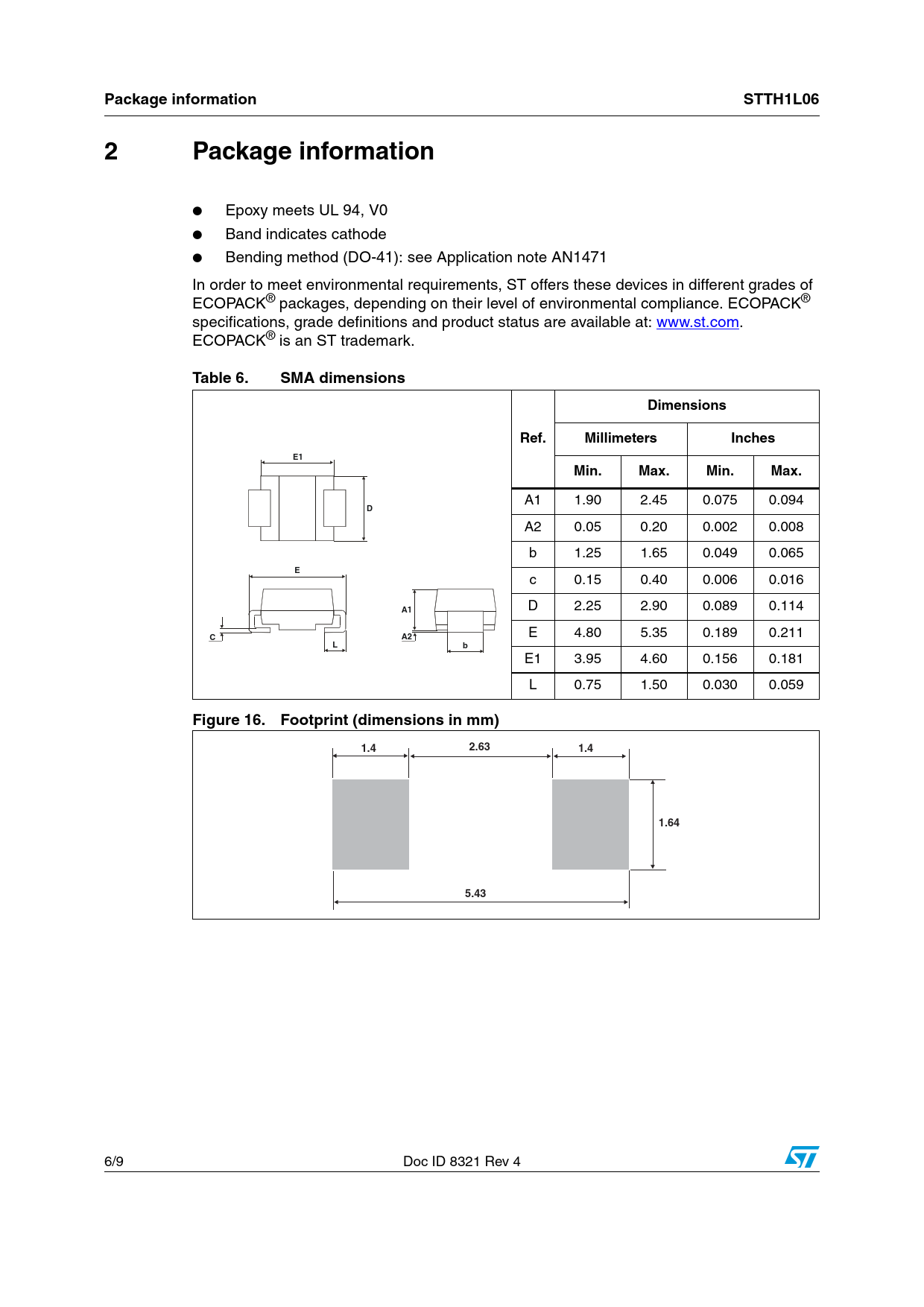 Package information. STTH1L06. 2 Package. information. Table 6. SMA dimensions. Dimensions. Ref. Millimeters. Inches. Min. Max. Figure 16
