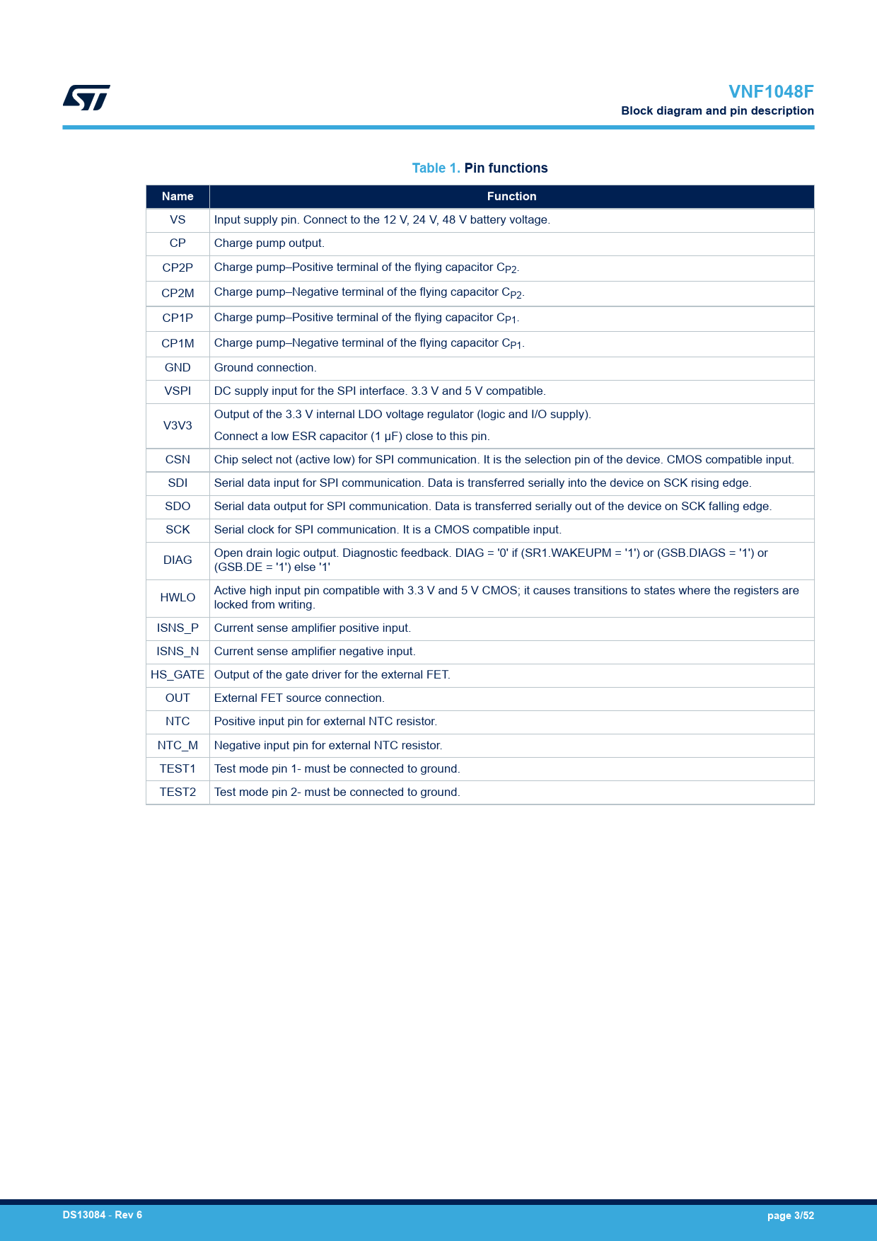 VNF1048F Block diagram and pin description Table 1 Pin functions Name Function DS13084 Rev 6 page 3/52