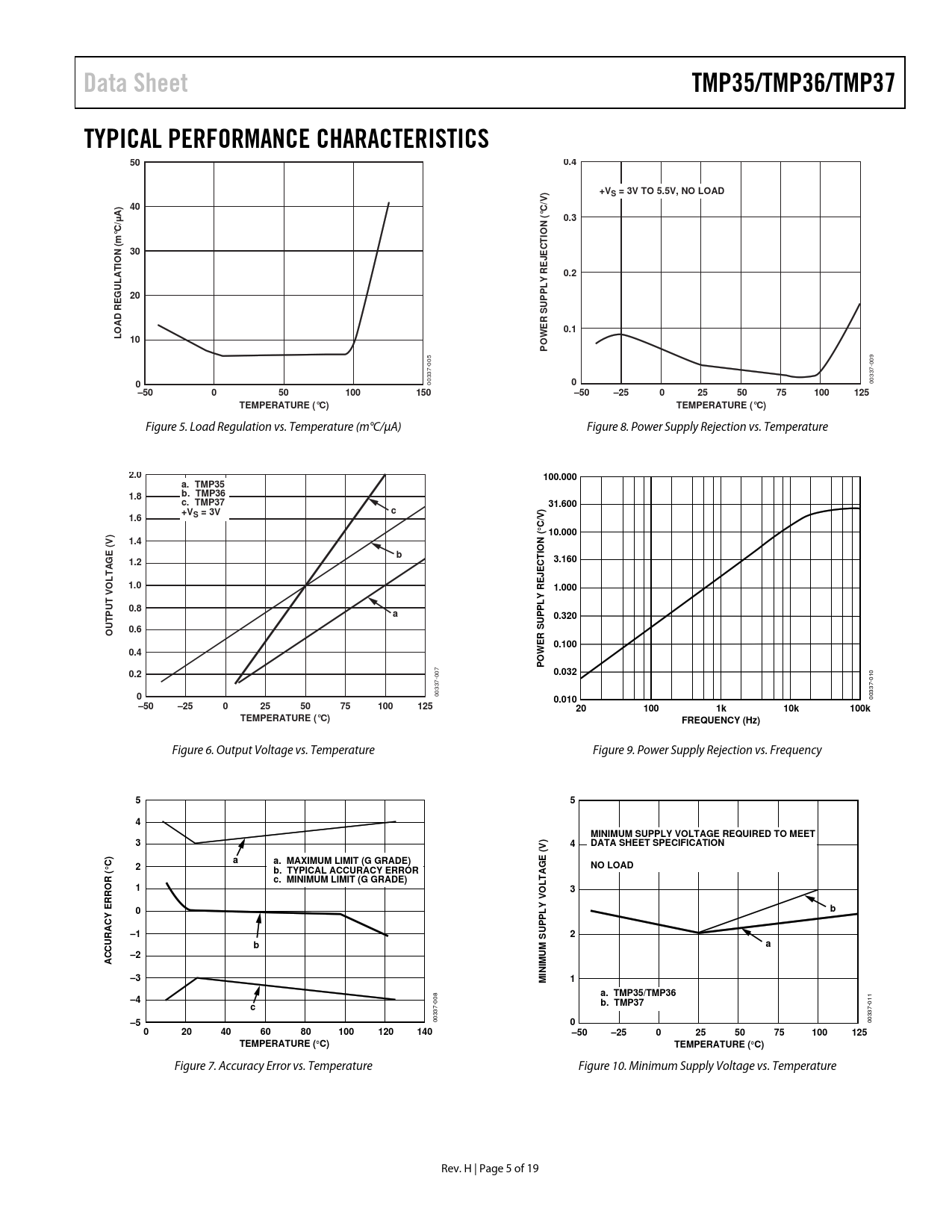 Data SheetTMP35/TMP36/TMP37TYPICAL PERFORMANCE CHARACTERISTICS500.4+VS = 3V TO 5.5V, NO LOAD/V)40CA) µ(°0.3C/N IOm°TN (30ECIOEJAT0.2Y RUL G20PPLSUAD REERO0.1LW10PO 005 009 0 00337- 0 00337- –50050100150–50–250255075100125TEMPERATURE (°C)TEMPERATURE (°C) Figure 5. Load Regulation vs. Temperature (m°C/µA) Figure 8. Power Supply Rejection vs. Temperature 2.0100.000a. TMP351.8b. TMP36 c. TMP3731.600+Vc1.6S = 3VC/V) ° )10.000V1.4(bGE1.23.160OLTA1.01.000T V U0.8aTP0.3200.6OU0.1000.4POWER SUPPLY REJECTION (0.20.032 007 0 00337- 0.010 00337-010 –50–250255075100125201001k10k100kTEMPERATURE (°C)FREQUENCY (Hz) Figure 6. Output Voltage vs. Temperature Figure 9. Power Supply Rejection vs. Frequency 554MINIMUM SUPPLY VOLTAGE REQUIRED TO MEET34DATA SHEET SPECIFICATIONaa. MAXIMUM LIMIT (G GRADE) ° C)2NO LOADb. TYPICAL ACCURACY ERROR c. MINIMUM LIMIT (G GRADE)130b–12ba–2ACCURACY ERROR (–3MINIMUM SUPPLY VOLTAGE (V)1a. TMP35/TMP36–4b. TMP37c–5 00337-008 0 00337-011 020406080100120140–50–250255075100125TEMPERATURE ( ° C)TEMPERATURE ( ° C) Figure 7. Accuracy Error vs. Temperature Figure 10. Minimum Supply Voltage vs. Temperature Rev. H | Page 5 of 19