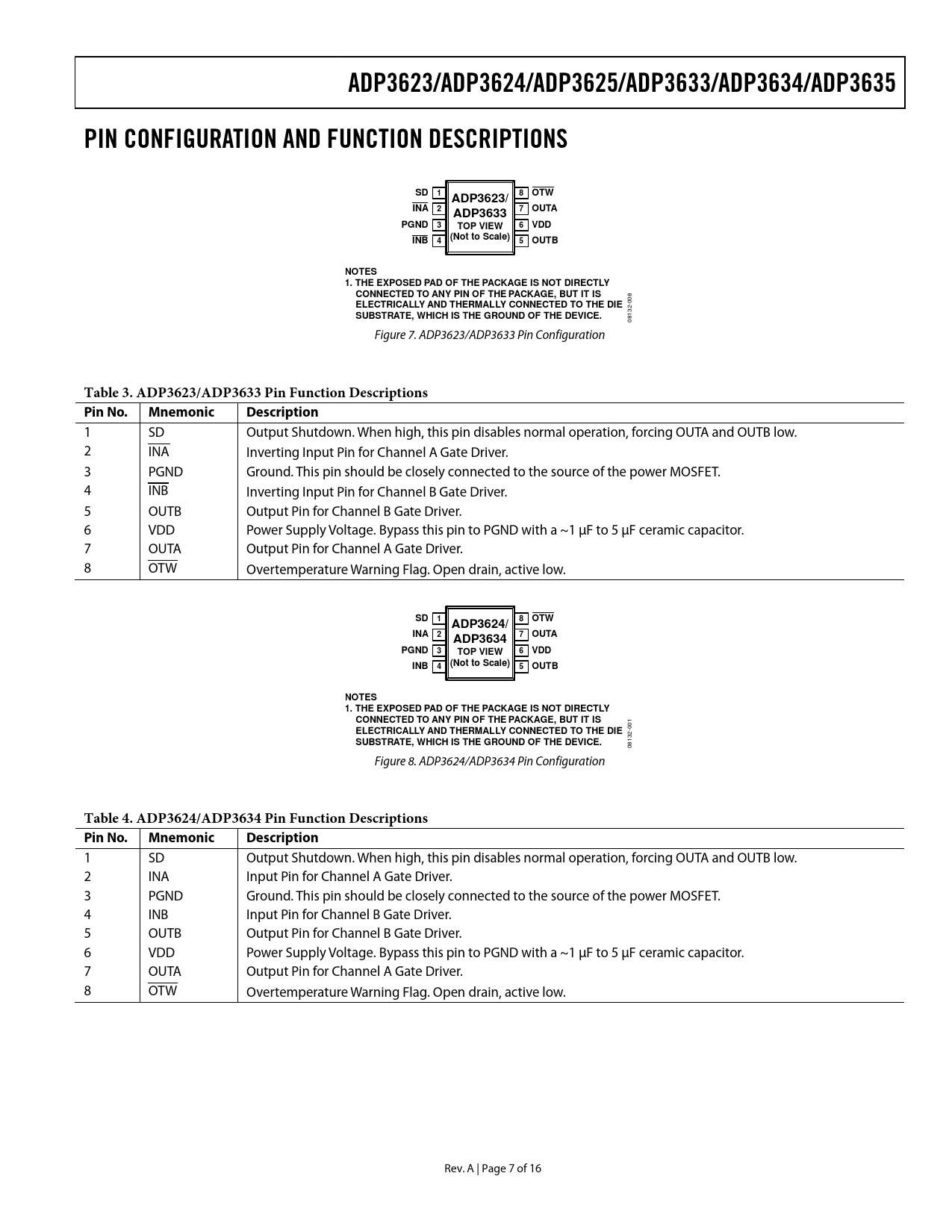 SD 1 8 OTW ADP3624/ INA 2 7 OUTA ADP3634 PGND 3 6 TOP VIEW VDD INB (Not to Scale) 4 5 OUTB NOTES 1. THE EXPOSED PAD OF THE PACKAGE IS NOT DIRECTLY CONNECTED TO ANY PIN OF THE PACKAGE, BUT IT IS ELECTRICALLY AND THERMALLY CONNECTED TO THE DIE