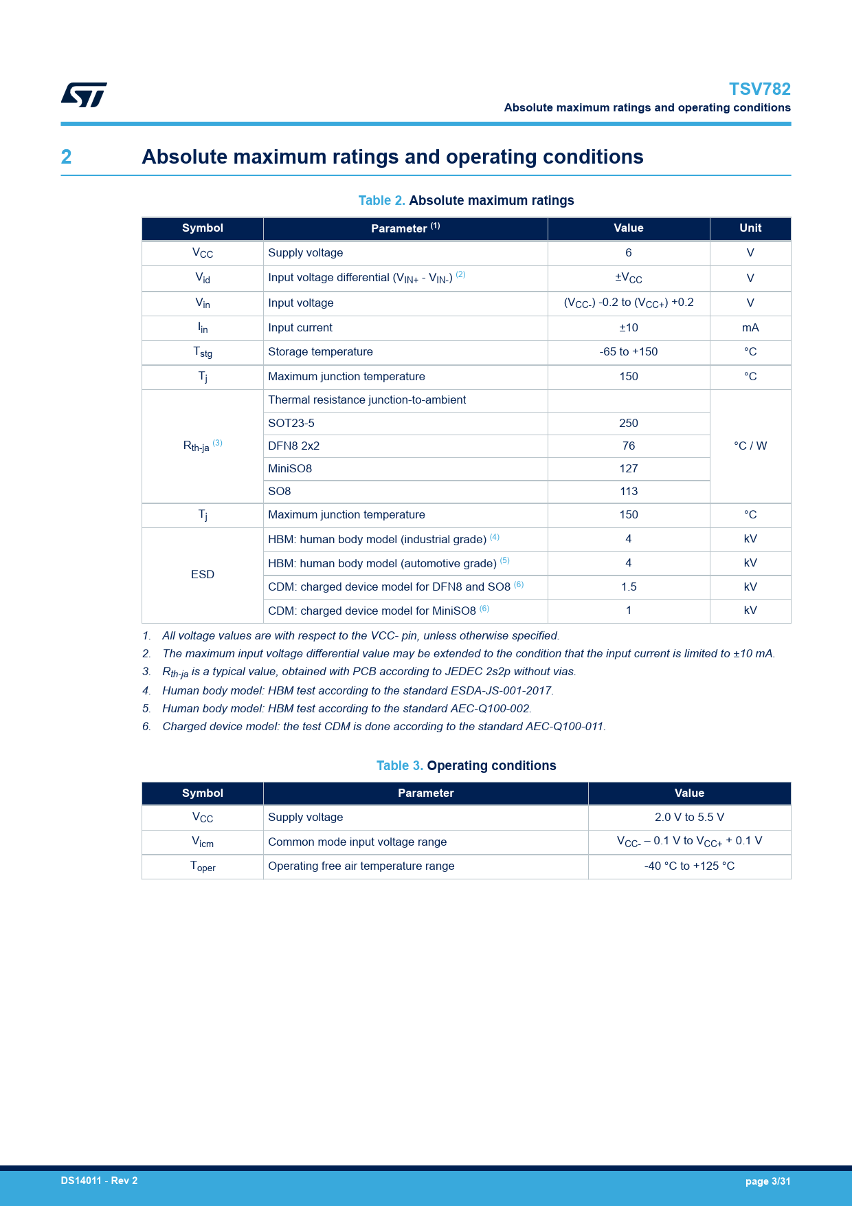 link to page 3 link to page 3 link to page 3 link to page 3 link to page 3 link to page 3 link to page 3 TSV782Absolute maximum ratings and operating conditions2Absolute maximum ratings and operating conditionsTable 2. Absolute maximum ratingsSymbolParameter (1)ValueUnit VCC Supply voltage 6 V Vid Input voltage differential (VIN+ - VIN-) (2) ±VCC V Vin Input voltage (VCC-) -0.2 to (VCC+) +0.2 V Iin Input current ±10 mA Tstg Storage temperature -65 to +150 °C Tj Maximum junction temperature 150 °C Thermal resistance junction-to-ambient SOT23-5 250 Rth-ja (3) DFN8 2x2 76 °C / W MiniSO8 127 SO8 113 Tj Maximum junction temperature 150 °C HBM: human body model (industrial grade) (4) 4 kV HBM: human body model (automotive grade) (5) 4 kV ESD CDM: charged device model for DFN8 and SO8 (6) 1.5 kV CDM: charged device model for MiniSO8 (6) 1 kV 1. All voltage values are with respect to the VCC- pin, unless otherwise specified. 2. The maximum input voltage differential value may be extended to the condition that the input current is limited to ±10 mA. 3. Rth-ja is a typical value, obtained with PCB according to JEDEC 2s2p without vias. 4. Human body model: HBM test according to the standard ESDA-JS-001-2017. 5. Human body model: HBM test according to the standard AEC-Q100-002. 6. Charged device model: the test CDM is done according to the standard AEC-Q100-011. Table 3. Operating conditionsSymbolParameterValue VCC Supply voltage 2.0 V to 5.5 V Vicm Common mode input voltage range VCC- – 0.1 V to VCC+ + 0.1 V Toper Operating free air temperature range -40 °C to +125 °C DS14011 - Rev 2page 3/31 Document Outline Features Applications Description 1 Pin description 1.1 TSV782 dual operational amplifier 2 Absolute maximum ratings and operating conditions 3 Electrical characteristics 4 Typical performance characteristics 5 Application information 5.1 Operating voltages 5.2 Input offset voltage drift over the temperature 5.3 Long term input offset voltage drift 5.4 Unused channel 5.5 EMI rejection 5.6 Maximum power dissipation 5.7 Capacitive load and stability 5.8 Resistor values for high speed op amp design 5.9 PCB layout recommendations 5.10 Decoupling capacitor 5.11 Macromodel 6 Typical applications 6.1 Low-side current sensing 6.2 Photodiode transimpedance amplification 7 Package information 7.1 DFN8 2x2 package information 7.2 MiniSO8 package information 7.3 SO8 package information 8 Ordering information Revision history