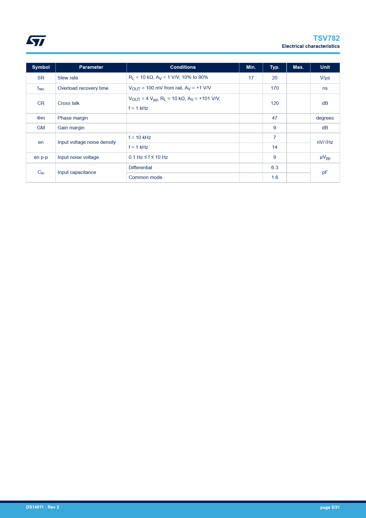 TSV782. Electrical characteristics. Symbol. Parameter. Conditions. Min. Typ. Max. Unit. DS14011. Rev 2. page 5/31