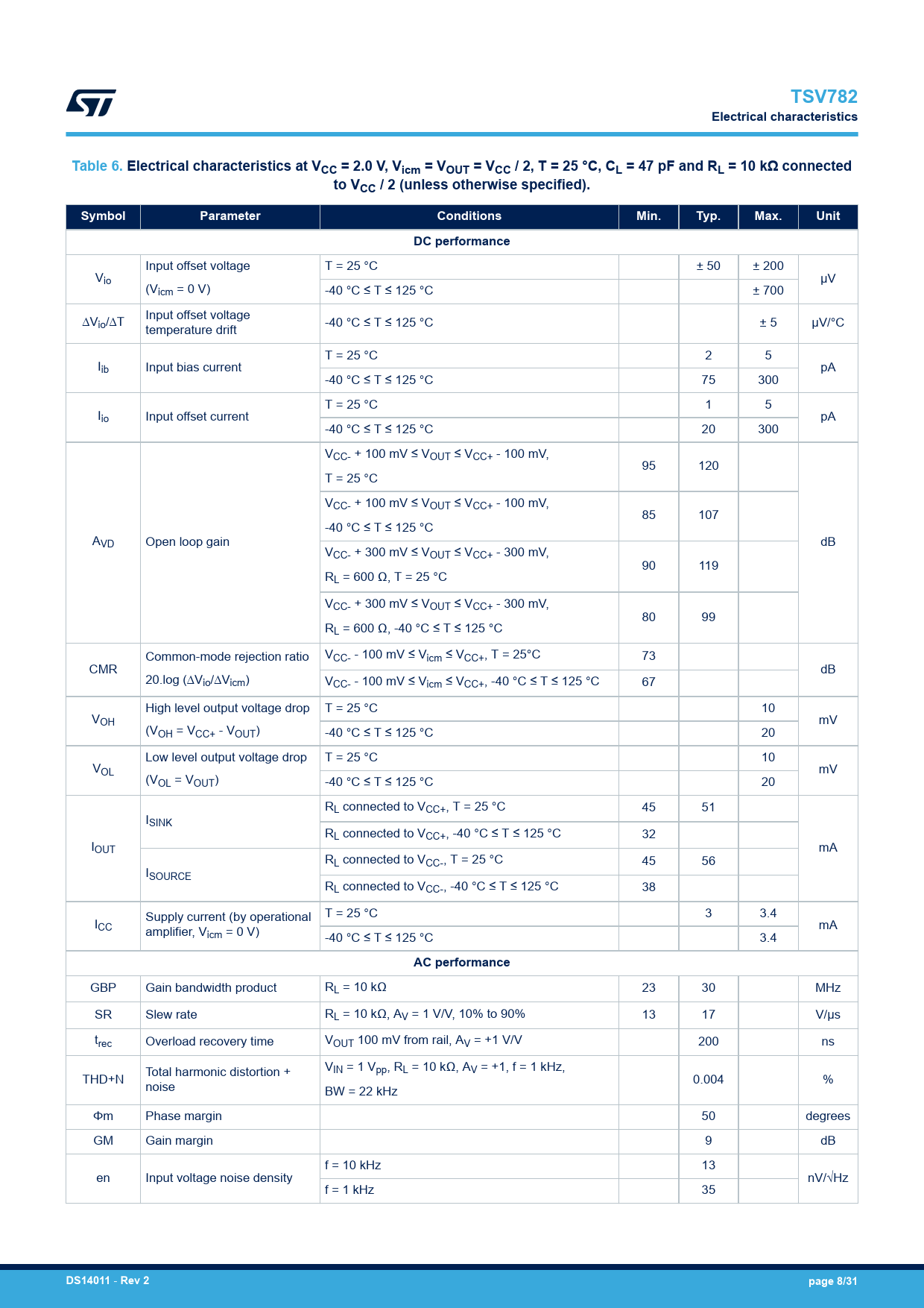 TSV782Electrical characteristicsTable 6. Electrical characteristics at VCC = 2.0 V, Vicm = VOUT = VCC / 2, T = 25 °C, CL = 47 pF and RL = 10 kΩ connectedto VCC / 2 (unless otherwise specified).SymbolParameterConditionsMin.Typ.Max.UnitDC performance Input offset voltage T = 25 °C ± 50 ± 200 Vio µV (Vicm = 0 V) -40 °C ≤ T ≤ 125 °C ± 700 ∆Vio/∆T Input offset voltage -40 °C ≤ T ≤ 125 °C ± 5 µV/°C temperature drift T = 25 °C 2 5 Iib Input bias current pA -40 °C ≤ T ≤ 125 °C 75 300 T = 25 °C 1 5 Iio Input offset current pA -40 °C ≤ T ≤ 125 °C 20 300 VCC- + 100 mV ≤ VOUT ≤ VCC+ - 100 mV, 95 120 T = 25 °C VCC- + 100 mV ≤ VOUT ≤ VCC+ - 100 mV, 85 107 -40 °C ≤ T ≤ 125 °C AVD Open loop gain dB VCC- + 300 mV ≤ VOUT ≤ VCC+ - 300 mV, 90 119 RL = 600 Ω, T = 25 °C VCC- + 300 mV ≤ VOUT ≤ VCC+ - 300 mV, 80 99 RL = 600 Ω, -40 °C ≤ T ≤ 125 °C Common-mode rejection ratio VCC- - 100 mV ≤ Vicm ≤ VCC+, T = 25°C 73 CMR dB 20.log (∆Vio/∆Vicm) VCC- - 100 mV ≤ Vicm ≤ VCC+, -40 °C ≤ T ≤ 125 °C 67 High level output voltage drop T = 25 °C 10 VOH mV (VOH = VCC+ - VOUT) -40 °C ≤ T ≤ 125 °C 20 Low level output voltage drop T = 25 °C 10 VOL mV (VOL = VOUT) -40 °C ≤ T ≤ 125 °C 20 RL connected to VCC+, T = 25 °C 45 51 ISINK RL connected to VCC+, -40 °C ≤ T ≤ 125 °C 32 IOUT mA RL connected to VCC-, T = 25 °C 45 56 ISOURCE RL connected to VCC-, -40 °C ≤ T ≤ 125 °C 38 Supply current (by operational T = 25 °C 3 3.4 ICC amplifier, V mA icm = 0 V) -40 °C ≤ T ≤ 125 °C 3.4 AC performance GBP Gain bandwidth product RL = 10 kΩ 23 30 MHz SR Slew rate RL = 10 kΩ, AV = 1 V/V, 10% to 90% 13 17 V/µs trec Overload recovery time VOUT 100 mV from rail, AV = +1 V/V 200 ns Total harmonic distortion + VIN = 1 Vpp, RL = 10 kΩ, AV = +1, f = 1 kHz, THD+N 0.004 % noise BW = 22 kHz Φm Phase margin 50 degrees GM Gain margin 9 dB f = 10 kHz 13 en Input voltage noise density nV/√Hz f = 1 kHz 35 DS14011 - Rev 2page 8/31 Document Outline Features Applications Description 1 Pin description 1.1 TSV782 dual operational amplifier 2 Absolute maximum ratings and operating conditions 3 Electrical characteristics 4 Typical performance characteristics 5 Application information 5.1 Operating voltages 5.2 Input offset voltage drift over the temperature 5.3 Long term input offset voltage drift 5.4 Unused channel 5.5 EMI rejection 5.6 Maximum power dissipation 5.7 Capacitive load and stability 5.8 Resistor values for high speed op amp design 5.9 PCB layout recommendations 5.10 Decoupling capacitor 5.11 Macromodel 6 Typical applications 6.1 Low-side current sensing 6.2 Photodiode transimpedance amplification 7 Package information 7.1 DFN8 2x2 package information 7.2 MiniSO8 package information 7.3 SO8 package information 8 Ordering information Revision history