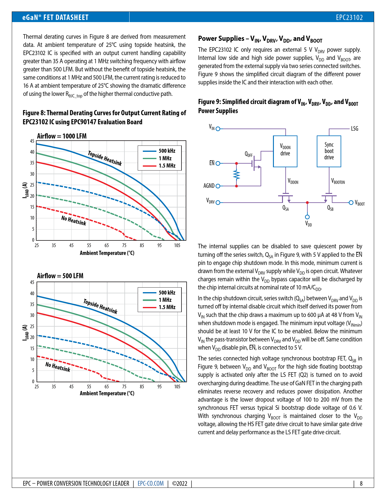 advantage is the lower dropout voltage of 100 to 200 mV from the synchronous FET versus typical Si bootstrap diode voltage of 0.6 V. With synchronous charging VBOOT is maintained closer to the VDD voltage, al owing the HS FET gate drive circuit to have similar gate drive current and delay performance as the LS FET gate drive circuit. EPC – POWER CONVERSION TECHNOLOGY LEADER | EPC-CO.COM | ©2022 | | 8