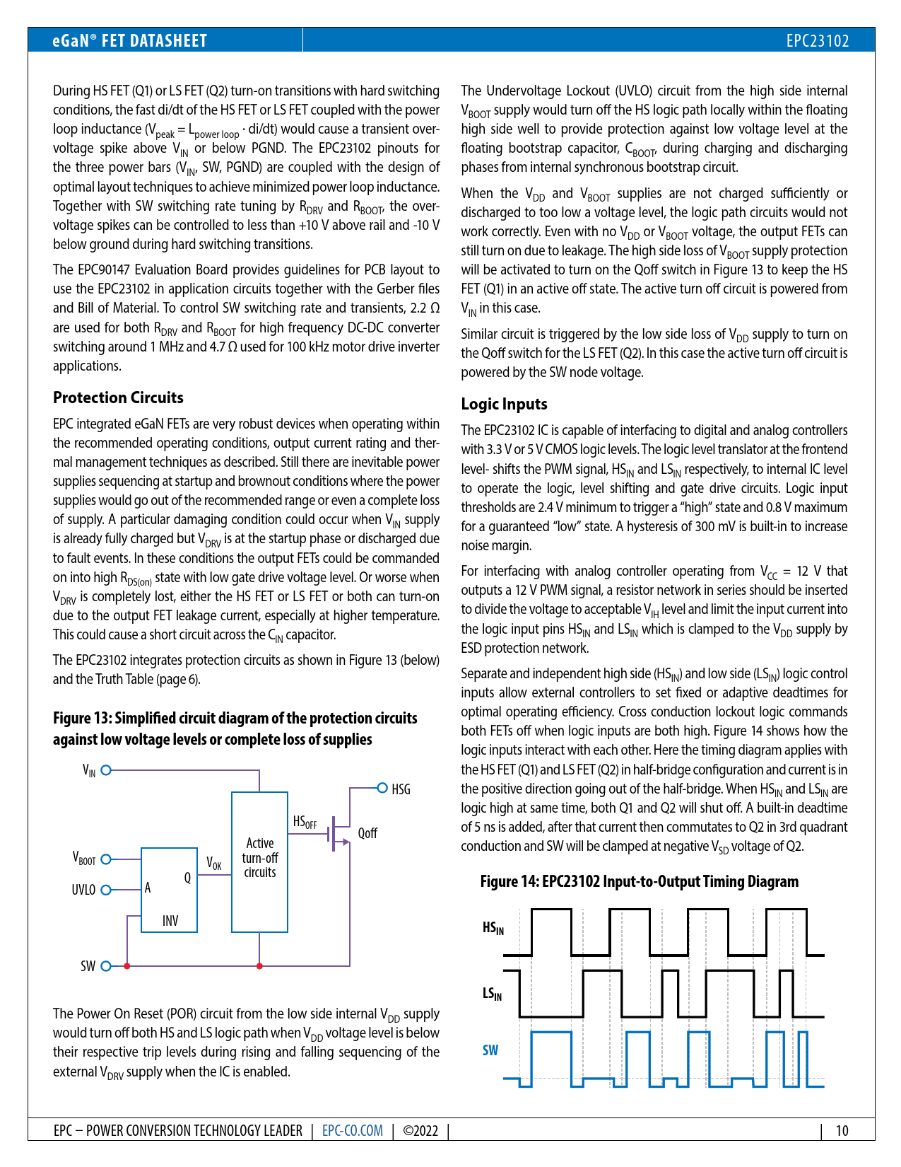 EPC integrated eGaN FETs are very robust devices when operating within The EPC23102 IC is capable of interfacing to digital and analog control ers the recommended operating conditions, output current rating and ther- with 3.3 V or 5 V CMOS logic levels. The logic level translator at the frontend mal management techniques as described. Still there are inevitable power level- shifts the PWM signal, HS supplies sequencing at startup and brownout conditions where the power IN and LSIN respectively, to internal IC level to operate the logic, level shifting and gate drive circuits. Logic input supplies would go out of the recommended range or even a complete loss thresholds are 2.4 V minimum to trigger a “high” state and 0.8 V maximum of supply. A particular damaging condition could occur when VIN supply for a guaranteed “low” state. A hysteresis of 300 mV is built-in to increase is already fully charged but VDRV is at the startup phase or discharged due noise margin. to fault events. In these conditions the output FETs could be commanded on into high R For interfacing with analog control er operating from V DS(on) state with low gate drive voltage level. Or worse when CC = 12 V that V outputs a 12 V PWM signal, a resistor network in series should be inserted DRV is completely lost, either the HS FET or LS FET or both can turn-on due to the output FET leakage current, especial y at higher temperature. to divide the voltage to acceptable VIH level and limit the input current into This could cause a short circuit across the C the logic input pins HS IN capacitor. IN and LSIN which is clamped to the VDD supply by ESD protection network. The EPC23102 integrates protection circuits as shown in Figure 13 (below) and the Truth Table (page 6). Separate and independent high side (HSIN) and low side (LSIN) logic control inputs al ow external control ers to set fixed or adaptive deadtimes for optimal operating efficiency. Cross conduction lockout logic commands
