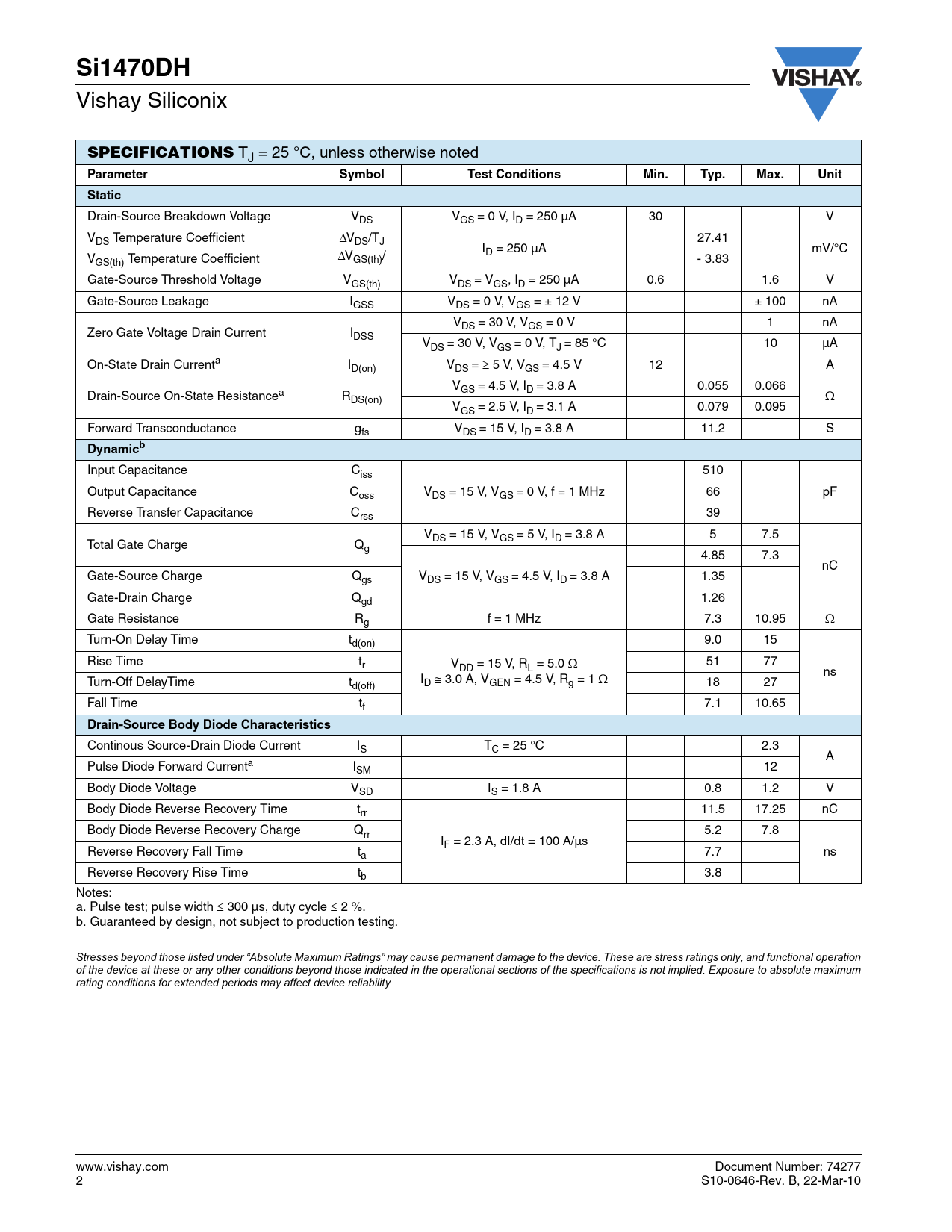 Si1470DH Vishay Siliconix SPECIFICATIONS TJ = 25 °C, unless otherwise noted Parameter SymbolTestConditionsMin.Typ.Max.UnitStatic Drain-Source Breakdown Voltage VDS VGS = 0 V, ID = 250 µA 30 V VDS Temperature Coefficient ΔVDS/TJ 27.41 ID = 250 µA mV/°C VGS(th) Temperature Coefficient ΔVGS(th)/ - 3.83 Gate-Source Threshold Voltage VGS(th) VDS = VGS, ID = 250 µA 0.6 1.6 V Gate-Source Leakage IGSS VDS = 0 V, VGS = ± 12 V ± 100 nA VDS = 30 V, VGS = 0 V 1 nA Zero Gate Voltage Drain Current IDSS VDS = 30 V, VGS = 0 V, TJ = 85 °C 10 µA On-State Drain Currenta ID(on) VDS = ≥ 5 V, VGS = 4.5 V 12 A VGS = 4.5 V, ID = 3.8 A 0.055 0.066 Drain-Source On-State Resistancea R Ω DS(on) VGS = 2.5 V, ID = 3.1 A 0.079 0.095 Forward Transconductance gfs VDS = 15 V, ID = 3.8 A 11.2 S Dynamicb Input Capacitance Ciss 510 Output Capacitance C V oss DS = 15 V, VGS = 0 V, f = 1 MHz 66 pF Reverse Transfer Capacitance Crss 39 VDS = 15 V, VGS = 5 V, ID = 3.8 A 5 7.5 Total Gate Charge Qg 4.85 7.3 nC Gate-Source Charge Q V gs DS = 15 V, VGS = 4.5 V, ID = 3.8 A 1.35 Gate-Drain Charge Qgd 1.26 Gate Resistance Rg f = 1 MHz 7.3 10.95 Ω Turn-On Delay Time td(on) 9.0 15 Rise Time tr V 51 77 DD = 15 V, RL = 5.0 Ω ns I Turn-Off DelayTime t D ≅ 3.0 A, VGEN = 4.5 V, Rg = 1 Ω d(off) 18 27 Fall Time tf 7.1 10.65 Drain-Source Body Diode Characteristics Continous Source-Drain Diode Current IS TC = 25 °C 2.3 A Pulse Diode Forward Currenta ISM 12 Body Diode Voltage VSD IS = 1.8 A 0.8 1.2 V Body Diode Reverse Recovery Time trr 11.5 17.25 nC Body Diode Reverse Recovery Charge Qrr 5.2 7.8 IF = 2.3 A, dI/dt = 100 A/µs Reverse Recovery Fall Time t ns a 7.7 Reverse Recovery Rise Time tb 3.8 Notes: a. Pulse test; pulse width ≤ 300 µs, duty cycle ≤ 2 %. b. Guaranteed by design, not subject to production testing. Stresses beyond those listed under “Absolute Maximum Ratings” may cause permanent damage to the device. These are stress ratings only, and functional operation of the device at these or any other conditions beyond those indicated in the operational sections of the specifications is not implied. Exposure to absolute maximum rating conditions for extended periods may affect device reliability. www.vishay.com Document Number: 74277 2 S10-0646-Rev. B, 22-Mar-10
