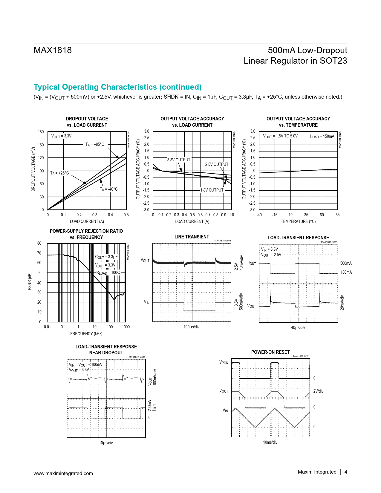 MAX1818 toc08 MAX1818 toc09 80 VIN = 3.3V 70 VOUT = 2.5V COUT = 3.3µF MAX1818 toc07 VOUT 60 IOUT 500mA VOUT = 3.3V 2.5V 10mV/div 50 RLOAD = 100Ω 100mA 40 PSRR (dB) 30 20 VIN 3.5V V 500mV/div OUT 20mV/div 10 0 0.01 0.1 1 10 100 1000 100µs/div 40µs/div FREQUENCY (kHz)