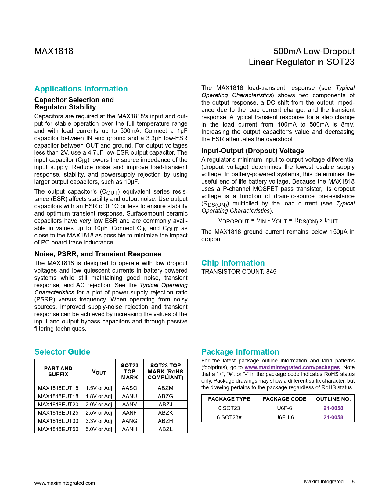 the output response: a DC shift from the output imped- ance due to the load current change, and the transient Capacitors are required at the MAX1818’s input and out- response. A typical transient response for a step change put for stable operation over the full temperature range in the load current from 100mA to 500mA is 8mV. and with load currents up to 500mA. Connect a 1μF Increasing the output capacitor’s value and decreasing capacitor between IN and ground and a 3.3μF low-ESR the ESR attenuates the overshoot. capacitor between OUT and ground. For output voltages less than 2V, use a 4.7μF low-ESR output capacitor. The