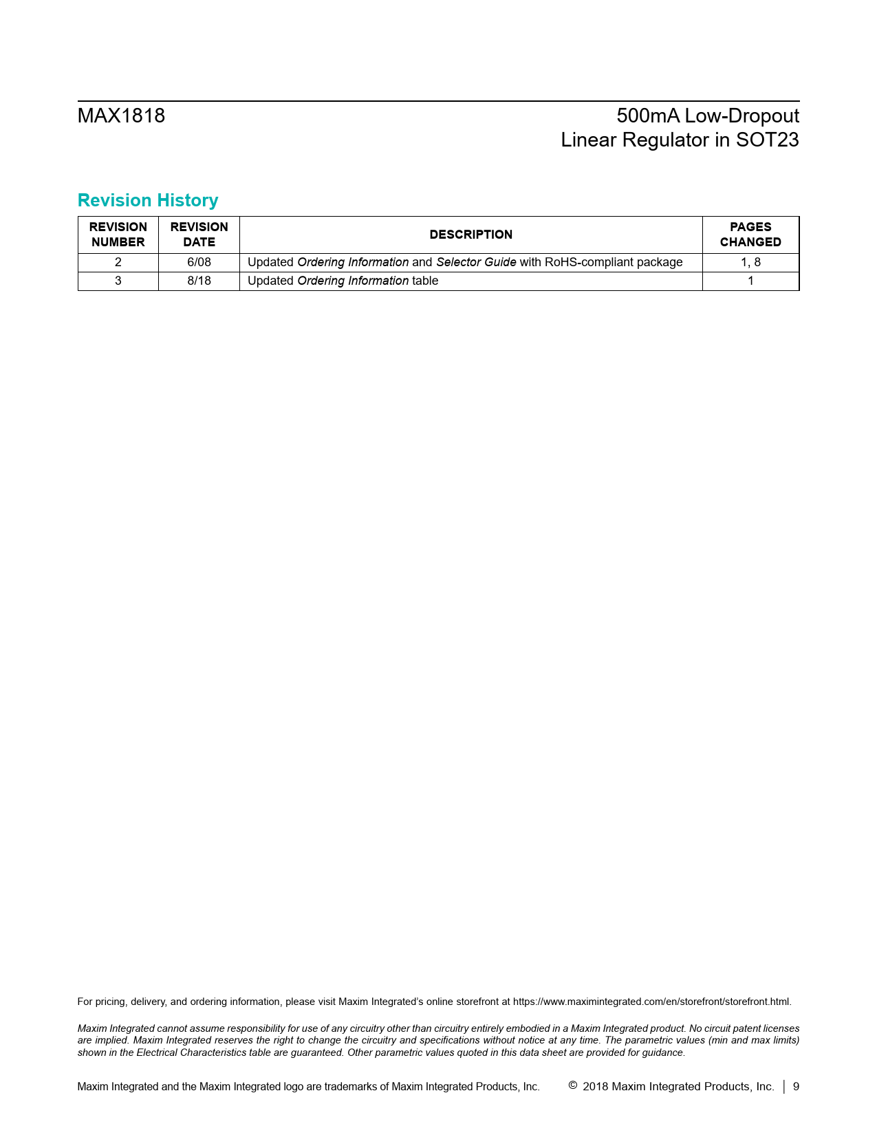 2 6/08 Updated Ordering Information and Selector Guide with RoHS-compliant package 1, 8 3 8/18 Updated Ordering Information table 1 For pricing, delivery, and ordering information, please visit Maxim Integrated’s online storefront at https://www.maximintegrated.com/en/storefront/storefront.html. Maxim Integrated cannot assume responsibility for use of any circuitry other than circuitry entirely embodied in a Maxim Integrated product. No circuit patent licenses are implied. Maxim Integrated reserves the right to change the circuitry and specifications without notice at any time. The parametric values (min and max limits) shown in the Electrical Characteristics table are guaranteed. Other parametric values quoted in this data sheet are provided for guidance. Maxim Integrated and the Maxim Integrated logo are trademarks of Maxim Integrated Products, Inc. © 2018 Maxim Integrated Products, Inc. │ 9