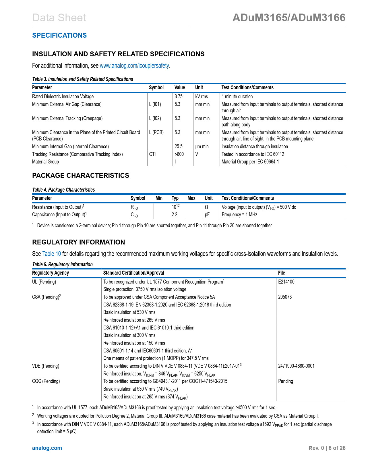 link to page 6 link to page 6 link to page 9 link to page 6 link to page 6 link to page 6 Data Sheet ADuM3165/ADuM3166SPECIFICATIONSINSULATION AND SAFETY RELATED SPECIFICATIONS For additional information, see www.analog.com/icouplersafety. Table 3. Insulation and Safety Related SpecificationsParameterSymbolValueUnitTest Conditions/Comments Rated Dielectric Insulation Voltage 3.75 kV rms 1 minute duration Minimum External Air Gap (Clearance) L (I01) 5.3 mm min Measured from input terminals to output terminals, shortest distance through air Minimum External Tracking (Creepage) L (I02) 5.3 mm min Measured from input terminals to output terminals, shortest distance path along body Minimum Clearance in the Plane of the Printed Circuit Board L (PCB) 5.3 mm min Measured from input terminals to output terminals, shortest distance (PCB Clearance) through air, line of sight, in the PCB mounting plane Minimum Internal Gap (Internal Clearance) 25.5 µm min Insulation distance through insulation Tracking Resistance (Comparative Tracking Index) CTI >600 V Tested in accordance to IEC 60112 Material Group I Material Group per IEC 60664-1 PACKAGE CHARACTERISTICSTable 4. Package CharacteristicsParameterSymbolMinTypMaxUnitTest Conditions/Comments Resistance (Input to Output)1 RI-O 1012 Ω Voltage (input to output) (VI-O) = 500 V dc Capacitance (Input to Output)1 CI-O 2.2 pF Frequency = 1 MHz 1 Device is considered a 2-terminal device; Pin 1 through Pin 10 are shorted together, and Pin 11 through Pin 20 are shorted together. REGULATORY INFORMATION See Table 10 for details regarding the recommended maximum working voltages for specific cross-isolation waveforms and insulation levels. Table 5. Regulatory InformationRegulatory AgencyStandard Certification/ApprovalFile UL (Pending) To be recognized under UL 1577 Component Recognition Program1 E214100 Single protection, 3750 V rms isolation voltage CSA (Pending)2 To be approved under CSA Component Acceptance Notice 5A 205078 CSA 62368-1-19, EN 62368-1:2020 and IEC 62368-1:2018 third edition Basic insulation at 530 V rms Reinforced insulation at 265 V rms CSA 61010-1-12+A1 and IEC 61010-1 third edition Basic insulation at 300 V rms Reinforced insulation at 150 V rms CSA 60601-1:14 and IEC60601-1 third edition, A1 One means of patient protection (1 MOPP) for 347.5 V rms VDE (Pending) To be certified according to DIN V VDE V 0884-11 (VDE V 0884-11):2017-013 2471900-4880-0001 Reinforced insulation, VIORM = 849 VPEAK, VIOSM = 6250 VPEAK CQC (Pending) To be certified according to GB4943.1-2011 per CQC11-471543-2015 Pending Basic insulation at 530 V rms (749 VPEAK) Reinforced insulation at 265 V rms (374 VPEAK) 1 In accordance with UL 1577, each ADuM3165/ADuM3166 is proof tested by applying an insulation test voltage ≥4500 V rms for 1 sec. 2 Working voltages are quoted for Pollution Degree 2, Material Group III. ADuM3165/ADuM3166 case material has been evaluated by CSA as Material Group I. 3 In accordance with DIN V VDE V 0884-11, each ADuM3165/ADuM3166 is proof tested by applying an insulation test voltage ≥1592 VPEAK for 1 sec (partial discharge detection limit = 5 pC). analog.comRev. 0 | 6 of 26 Document Outline Features Applications Functional Block Diagrams General Description Specifications Timing Specifications Insulation and Safety Related Specifications Package Characteristics Regulatory Information DIN V VDE V 0884-11 (VDE V 0884-11) Insulation Characteristics (Pending) Recommended Operating Conditions Absolute Maximum Ratings Thermal Resistance Electrostatic Discharge (ESD) Ratings ESD Ratings for ADuM3165/ADuM3166 ESD Caution Pin Configurations and Function Descriptions Truth Tables Typical Performance Characteristics Terminology Bus Upstream and Downstream Hub Host Peripheral Enumeration Low Speed Full Speed High Speed End of Packet (EOP) J State K State SE0 State SE1 State Idle L1 Suspend L2 Suspend Theory of Operation Automatic Data Transfer and Modes Retimer and Other Features Isolator Characteristics and Low Power Modes Applications Information Power Supply Options Clock Options PGOOD, Clock, and Power Sequencing Isolated USB Implementations Peripheral Applications Host Applications Interface Applications PCB Layout and Electromagnetic Interference (EMI) Insulation Lifetime Surface Tracking Insulation Wear Out Calculation and Use of Parameters Example Outline Dimensions Ordering Guide Evaluation Boards