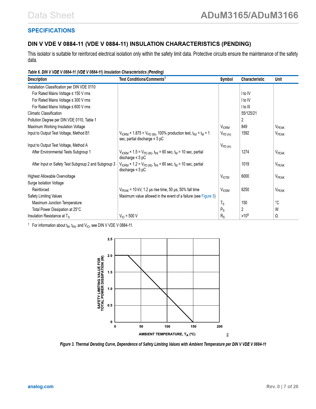 link to page 7 link to page 7 Data Sheet ADuM3165/ADuM3166SPECIFICATIONSDIN V VDE V 0884-11 (VDE V 0884-11) INSULATION CHARACTERISTICS (PENDING) This isolator is suitable for reinforced electrical isolation only within the safety limit data. Protective circuits ensure the maintenance of the safety data. Table 6. DIN V VDE V 0884-11 (VDE V 0884-11) Insulation Characteristics (Pending)DescriptionTest Conditions/Comments1SymbolCharacteristicUnit Installation Classification per DIN VDE 0110 For Rated Mains Voltage ≤ 150 V rms I to IV For Rated Mains Voltage ≤ 300 V rms I to IV For Rated Mains Voltage ≤ 600 V rms I to III Climatic Classification 55/125/21 Pollution Degree per DIN VDE 0110, Table 1 2 Maximum Working Insulation Voltage VIORM 849 VPEAK Input to Output Test Voltage, Method B1 VIORM × 1.875 = VPD (M), 100% production test, tINI = tM = 1 VPD (m) 1592 VPEAK sec, partial discharge < 5 pC Input to Output Test Voltage, Method A VPD (m) After Environmental Tests Subgroup 1 VIORM × 1.5 = VPD (M), tINI = 60 sec, tM = 10 sec, partial 1274 VPEAK discharge < 5 pC After Input or Safety Test Subgroup 2 and Subgroup 3 VIORM × 1.2 = VPD (M), tINI = 60 sec, tM = 10 sec, partial 1019 VPEAK discharge < 5 pC Highest Allowable Overvoltage VIOTM 6000 VPEAK Surge Isolation Voltage Reinforced VPEAK = 10 kV, 1.2 µs rise time, 50 µs, 50% fall time VIOSM 6250 VPEAK Safety Limiting Values Maximum value allowed in the event of a failure (see Figure 3) Maximum Junction Temperature TS 150 °C Total Power Dissipation at 25°C PS 2 W Insulation Resistance at TS VIO = 500 V RS >109 Ω 1 For information about tM, tINI, and VIO, see DIN V VDE V 0884-11. Figure 3. Thermal Derating Curve, Dependence of Safety Limiting Values with Ambient Temperature per DIN V VDE V 0884-11analog.comRev. 0 | 7 of 26 Document Outline Features Applications Functional Block Diagrams General Description Specifications Timing Specifications Insulation and Safety Related Specifications Package Characteristics Regulatory Information DIN V VDE V 0884-11 (VDE V 0884-11) Insulation Characteristics (Pending) Recommended Operating Conditions Absolute Maximum Ratings Thermal Resistance Electrostatic Discharge (ESD) Ratings ESD Ratings for ADuM3165/ADuM3166 ESD Caution Pin Configurations and Function Descriptions Truth Tables Typical Performance Characteristics Terminology Bus Upstream and Downstream Hub Host Peripheral Enumeration Low Speed Full Speed High Speed End of Packet (EOP) J State K State SE0 State SE1 State Idle L1 Suspend L2 Suspend Theory of Operation Automatic Data Transfer and Modes Retimer and Other Features Isolator Characteristics and Low Power Modes Applications Information Power Supply Options Clock Options PGOOD, Clock, and Power Sequencing Isolated USB Implementations Peripheral Applications Host Applications Interface Applications PCB Layout and Electromagnetic Interference (EMI) Insulation Lifetime Surface Tracking Insulation Wear Out Calculation and Use of Parameters Example Outline Dimensions Ordering Guide Evaluation Boards